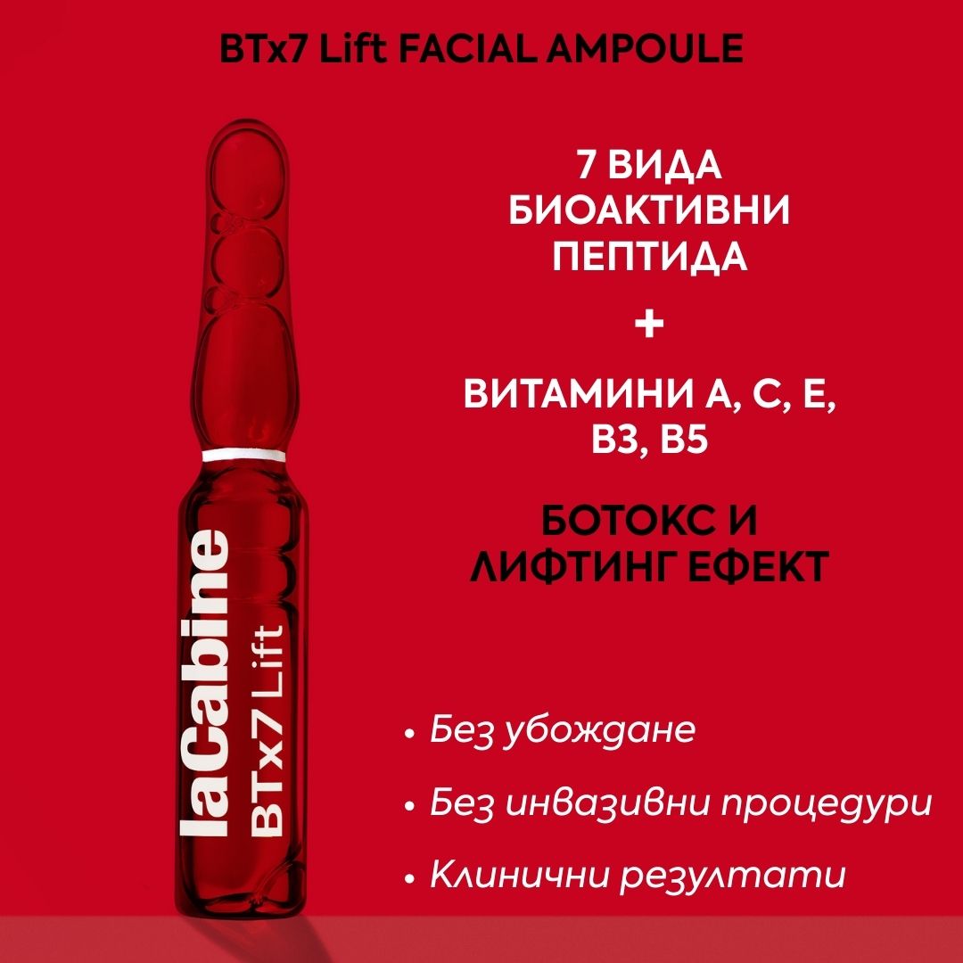 BTx7Lift Facial Ampoule е висококонцентрирана ампула за лице със 7 различни биоактивни пептида и коктейл от есенциални витамини. Видимо намалява мимическите линии и бръчките, предотвратява тяхното задълбочаване и забавя появата на нови. Осигурява мощно лифтинг действие, като ефективно стяга и повдига кожата.