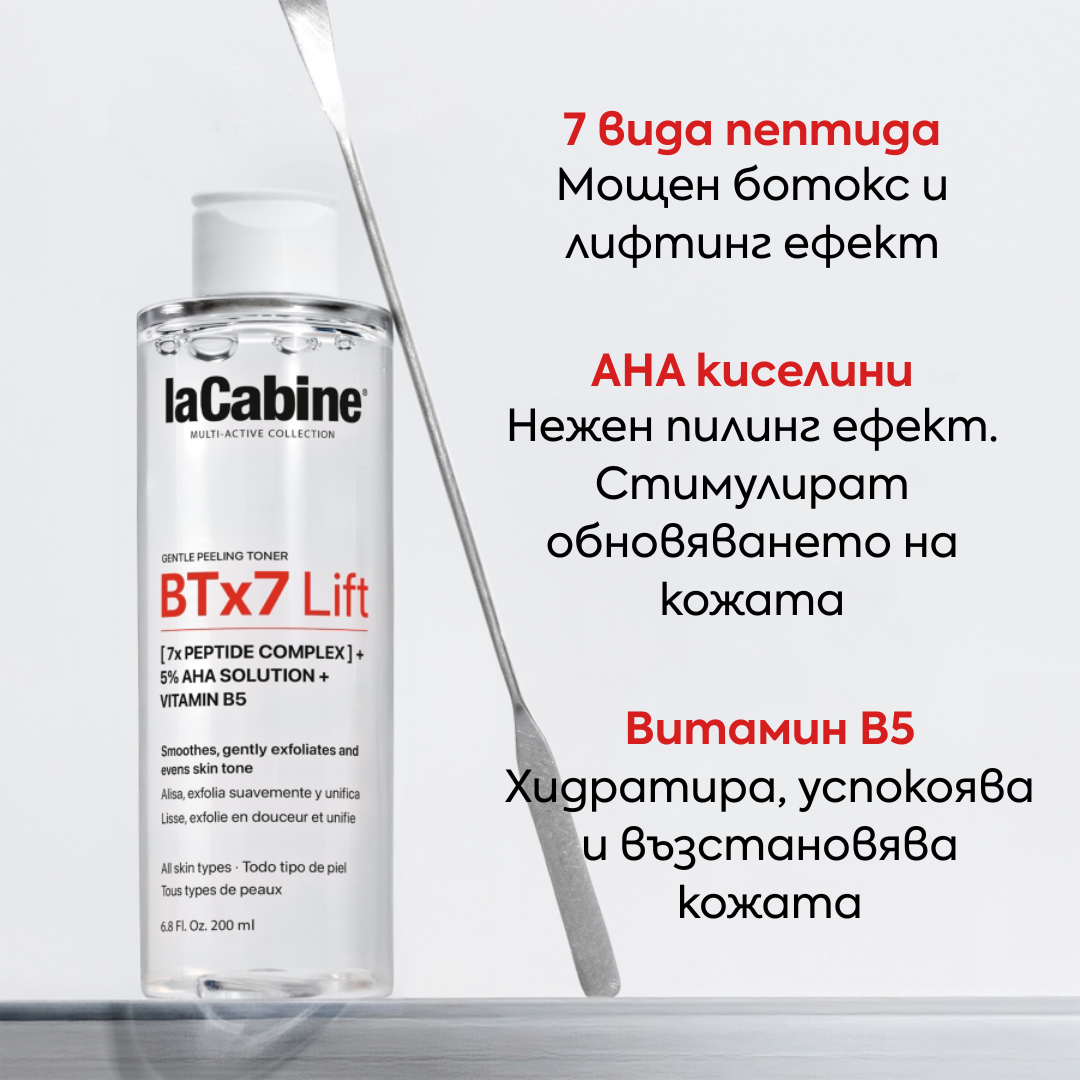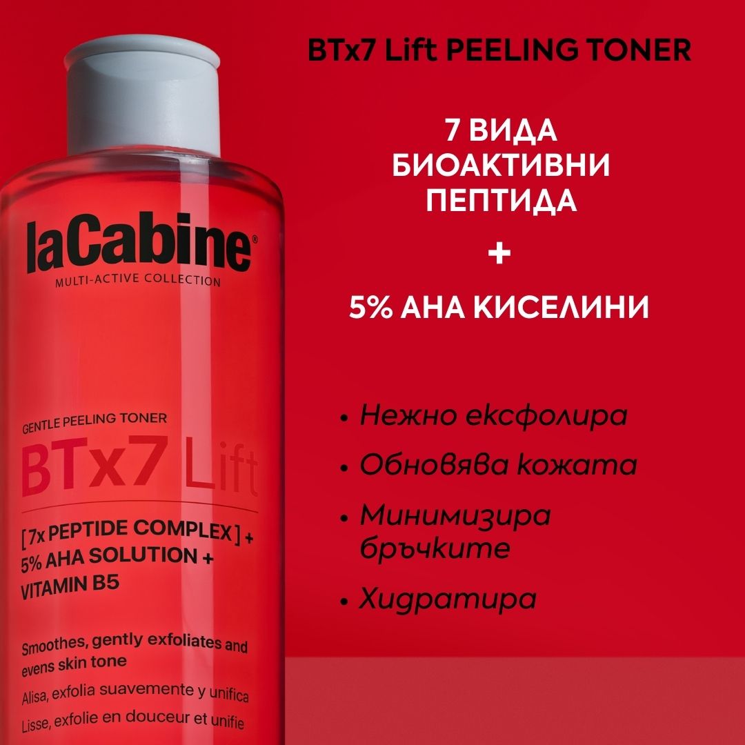 BTx7 Lift Peeling Toner e пилинг-тонер за лице, който обновява кожата и помага за минимизиране на мимическите бръчки. Нежно ексфолира, като премахва мъртвите клетки и по този начин осигурява равномерен, сияен и гладък вид.