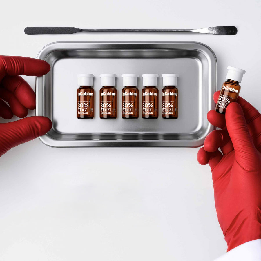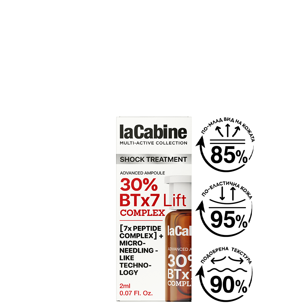 Технологоя с био-спикули с ефект на микронидлинг – био спикулите са микроскопични структури, извлечени от морски гъби и имат форма, наподобяваща микроигли. Благодарение на игловидната си форма те осъществяват нежна механична стимулация, която спомага за видимо регенериране на кожата. Освен това био-спикулите стимулират производството на колаген и еластин, което прави кожата стегната и тонизирана. Био спикулите като създават невидими микроканали в кожата и пот този начин подобряват усвояването на активните съставки. Така позволяват на активните компоненти да достигнат до по-дълбоките слоеве на епидермиса. Био-спикулите в ампула 30% BTx7 Lift съдържат пептида Acetyl Hexapeptide-8, който действа подобно на ботулиновия токсин, като моментално намалява видимите признаци на стареене, като дълбоки бръчки и фини линии. |