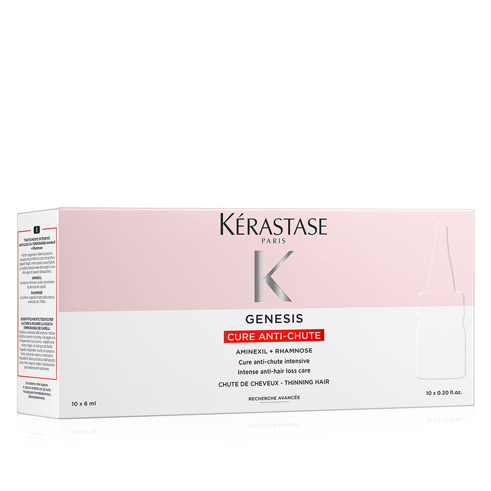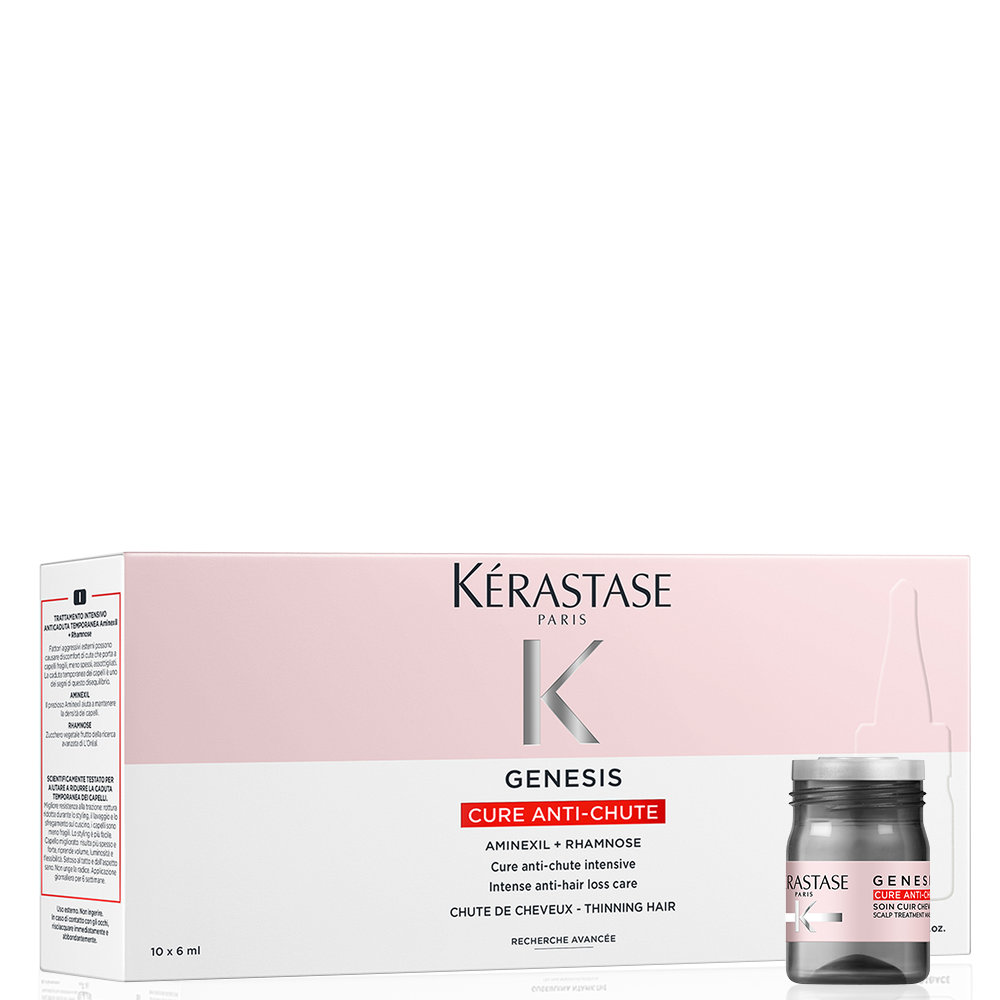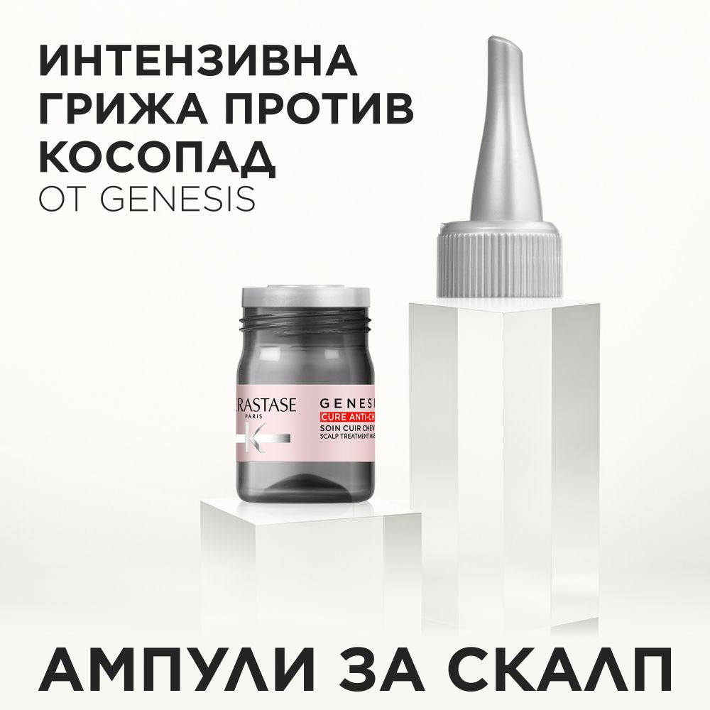 Ампули Kerastase Genesis Cure Anti-Chute са интензивна грижа против косопад, която помага за поддържане на плътността на косата, като намалява скоростта на косопада*. Помага за намаляване на накъсването на косата по време на стилизиране и измиване**. Косата се усеща по-плътна, с повече обем, блясък и еластичност. Осигурява леко действие, без утежняване.