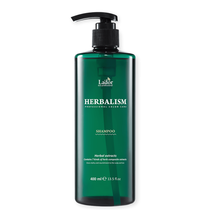 Билковият шампоан La’dor Herbalism Shampoo почиства скалпа в дълбочина, като намалява раздразнението и не нарушава естествения баланс на рН. Премахва пърхота и предотвратява лющенето на скалпа. Омекотява и придава блясък. Съдържа 7 вида растителни екстракти (лимон, лавандула, нар, градински чай, мента, евкалипт, пшеница) и 20 вида аминокиселини, които гарантират достатъчното количество на хранителни вещества за косата.