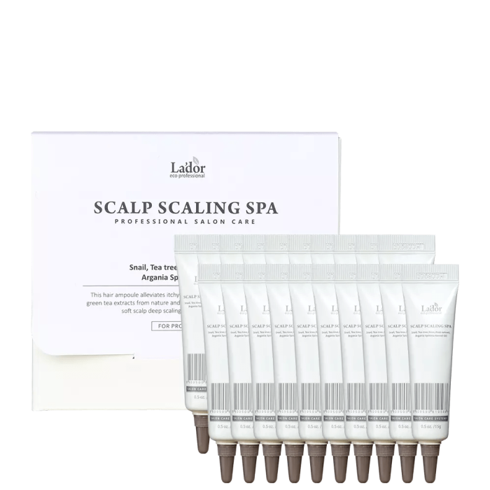 Ампулата La'dor Scalp Scaling SPA ексфолира скалпа нежно и в дълбочина, като отстранява мъртвите клетки и оставя скалпа почистен. Подобрява микроциркулацията и стимулира растежа на косата. Премахва излишния себум и остатъците от стилизиращи продукти. Подобрява регенерацията на кожата и бариерната функция на скалпа. Съдържа хидролизиран колаген, целулоза и ментол, който има противовъзпалително и освежаващо действие. Екстрактите от мента и секрет от охлюви нормализират секрецията на мастните жлези, засилват кръвообращението и ускоряват растежа на косата.