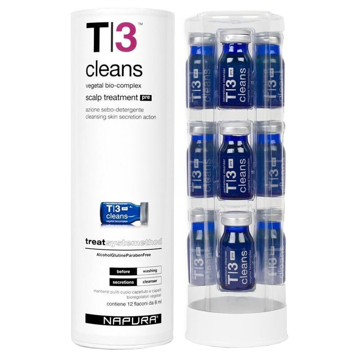 T/3 Cleans Post са ампули, които помагат да се регулира производството на себум, така че косата и скалпът да останат чисти за по-дълго време. Балансираният микс от естествени активни вещества и етерични масла прави косата красива и жива за дълго, а скалпът е чист, защитен и хидратиран.
