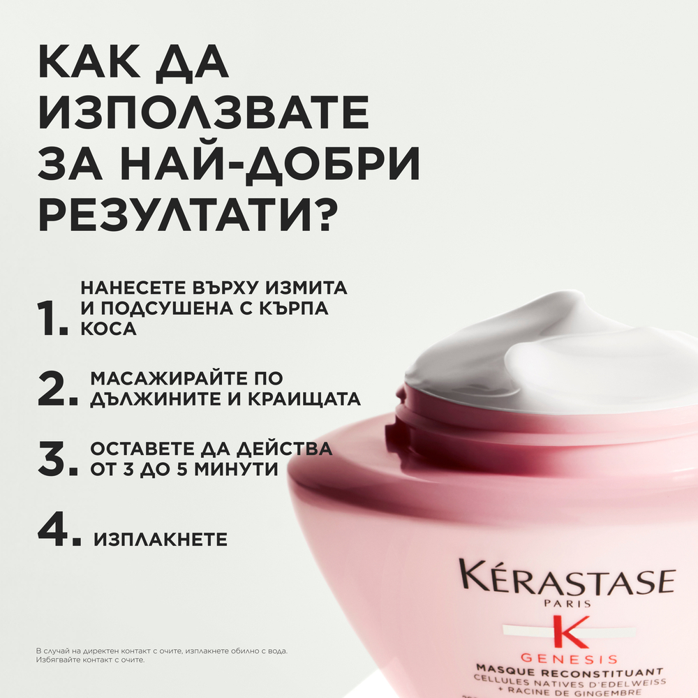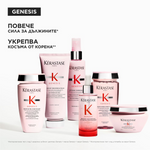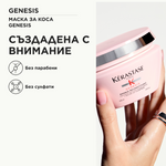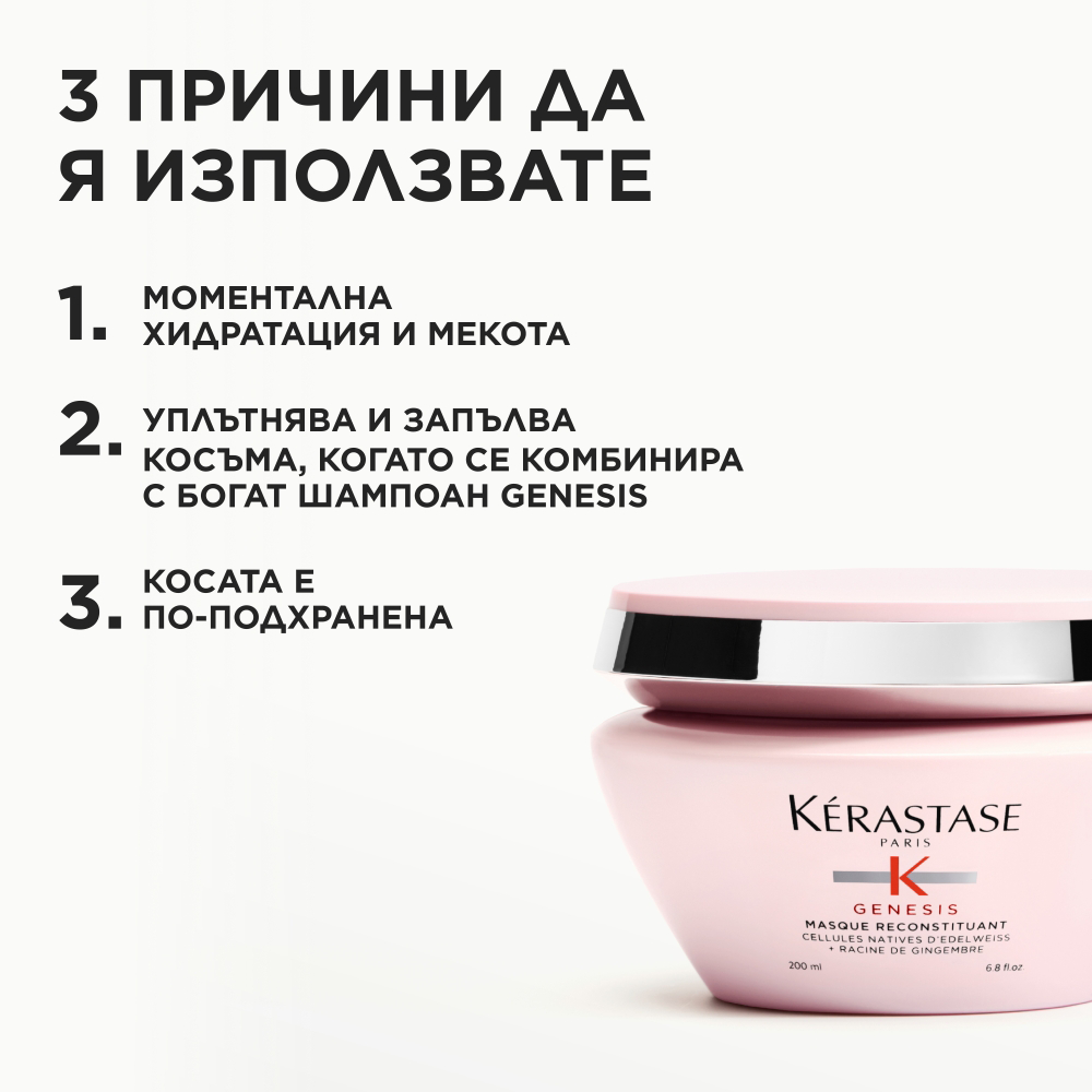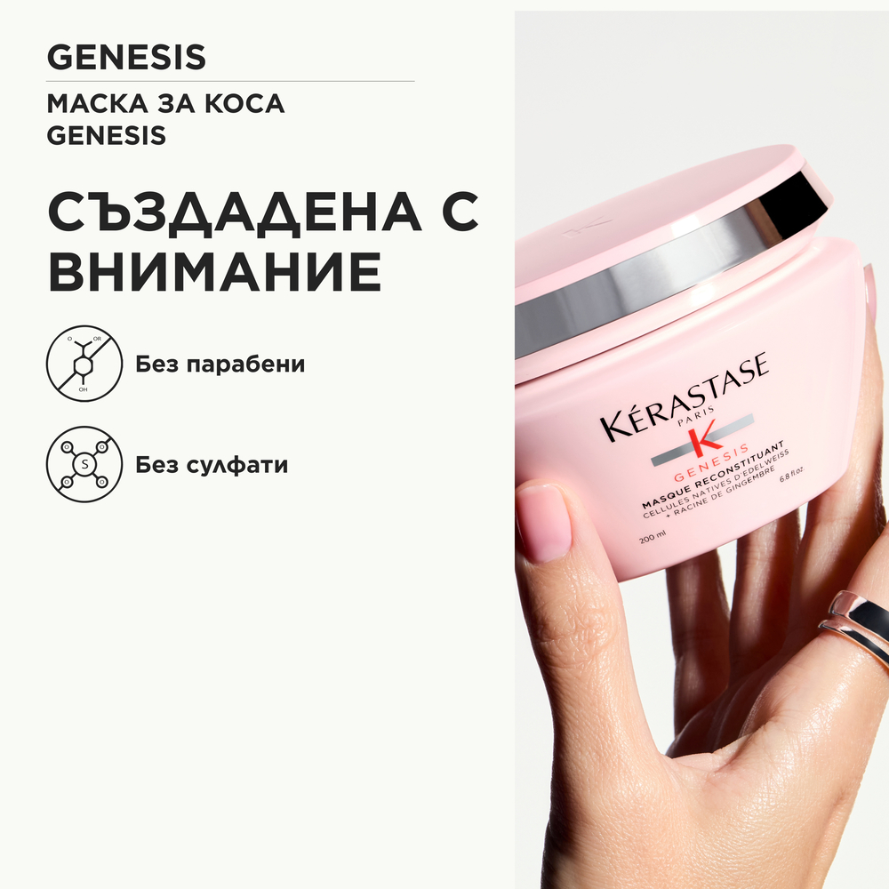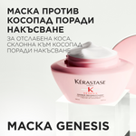 Маската Kerastase Genesis е подходяща за коса, склонна към косопад, причинен както от накъсване по дължините, така и вследствие на отслабване от корените. Богатата й формула интензивно подхранва и подсилва косата, за да намали риска от косопад поради накъсване. Съдържа с клетки от еделвайс и корен от джинджифил, които подсилват увредените зони на косъма. Мощната комбинация от подхранващи съставки прави косата лесна за разресване, мека и подхранена. В резултат всеки косъм е подсилен и блестящ.