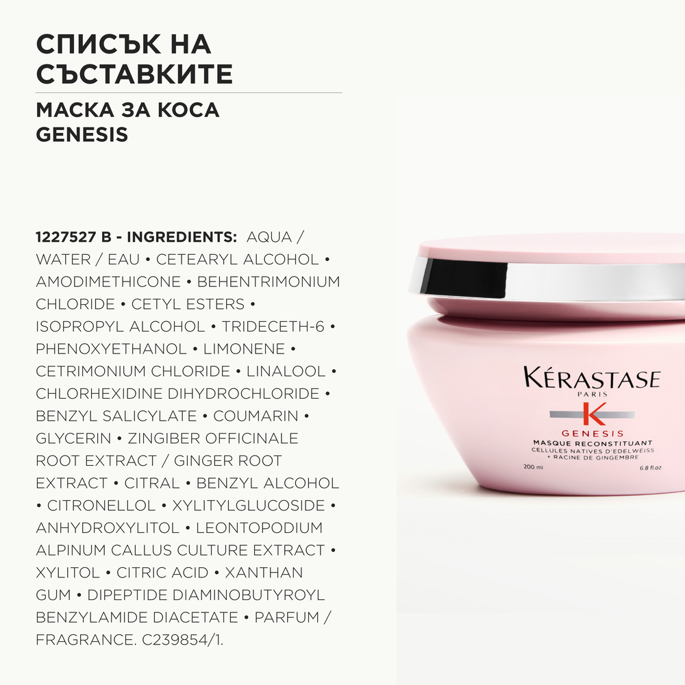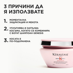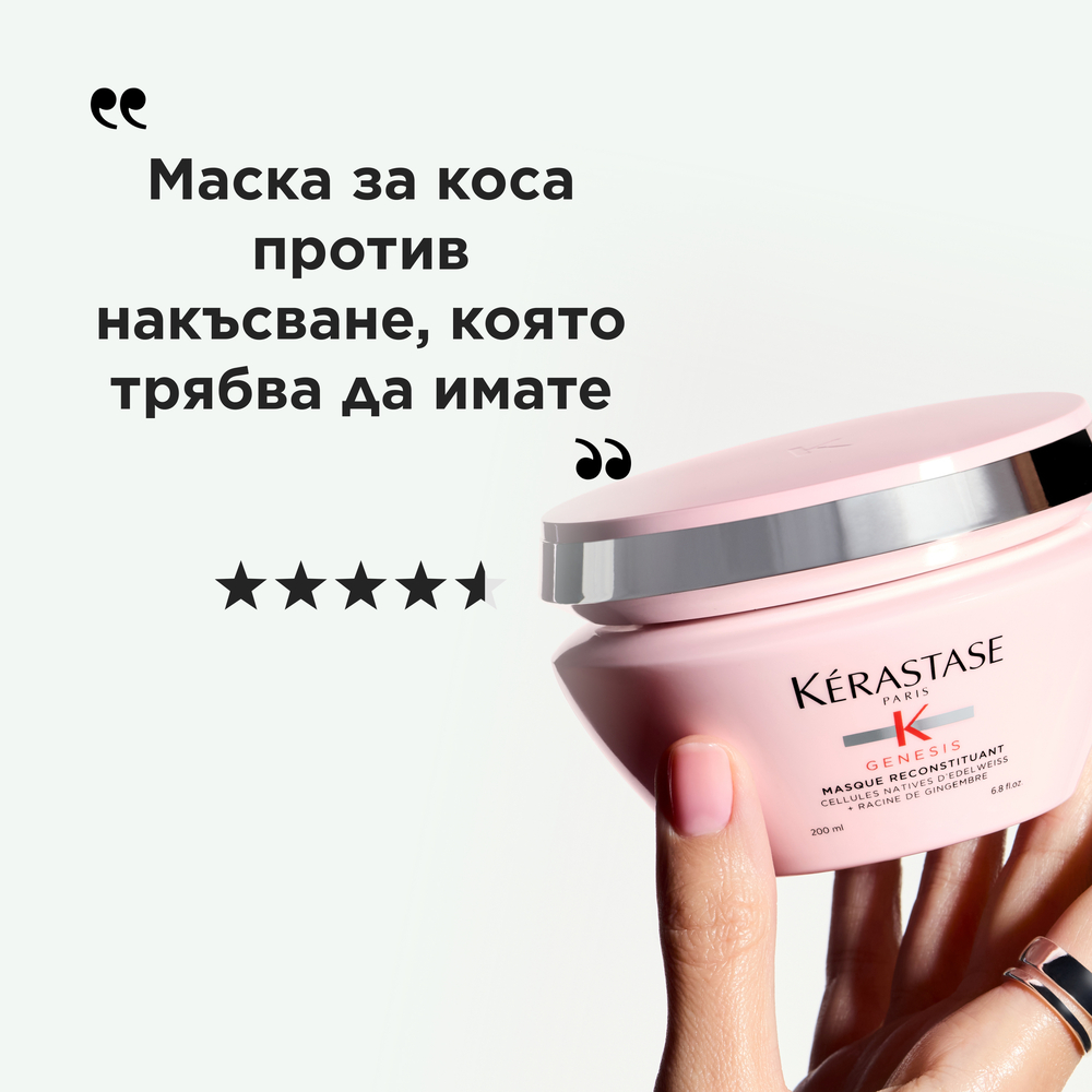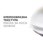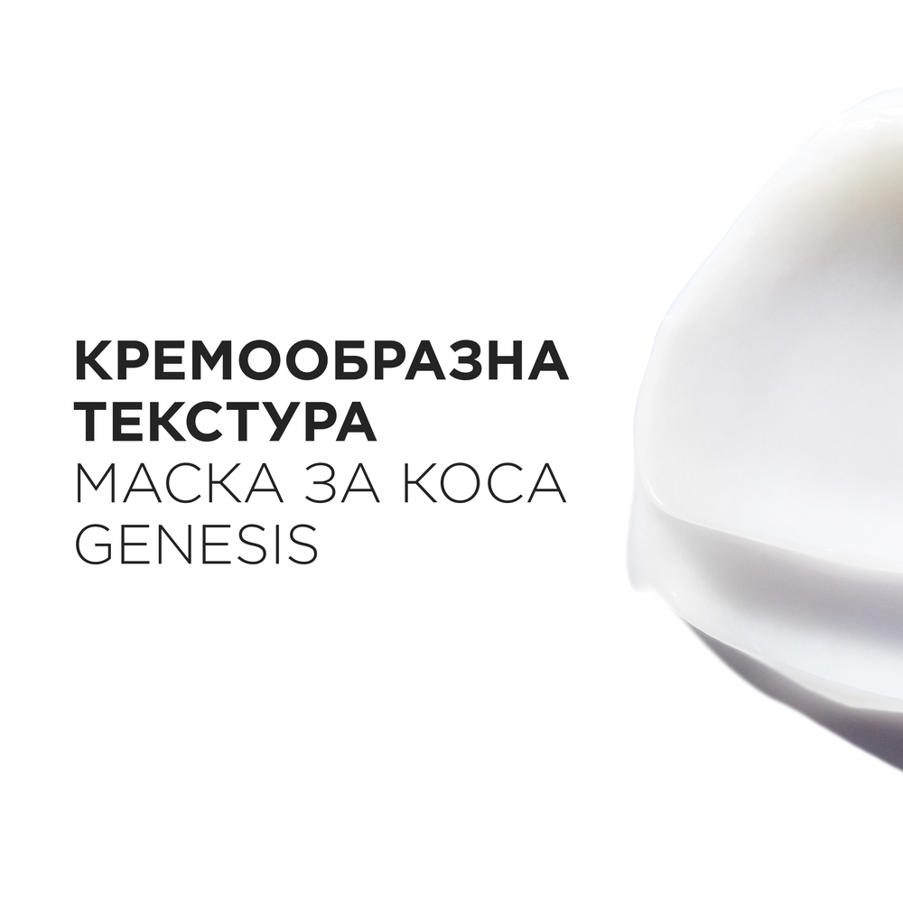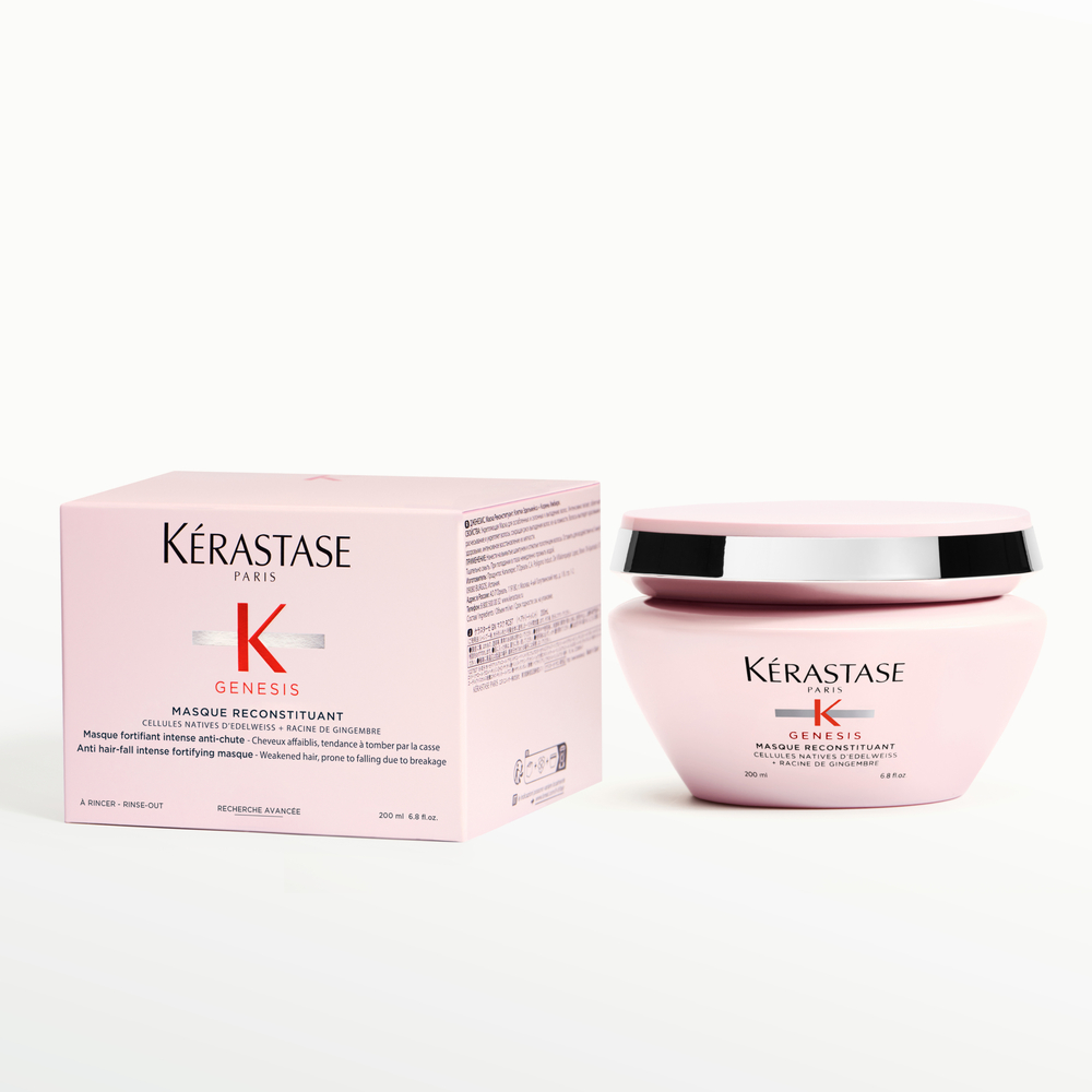 Маската Kerastase Genesis е подходяща за коса, склонна към косопад, причинен както от накъсване по дължините, така и вследствие на отслабване от корените. Богатата й формула интензивно подхранва и подсилва косата, за да намали риска от косопад поради накъсване. Съдържа с клетки от еделвайс и корен от джинджифил, които подсилват увредените зони на косъма. Мощната комбинация от подхранващи съставки прави косата лесна за разресване, мека и подхранена. В резултат всеки косъм е подсилен и блестящ.