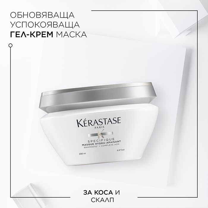 Обновяваща крем-маска Specifique Hydra-Apaisant за всеки тип скалп и коса. Успокоява и омекотява скалпа, а косата е възстановена, хидратирана и мека. Със своята немазна формула, маската е особено подходяща и при чувствителен скалп.