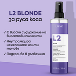 Двуфазен балсам без изплакване за руса коса LAKME L2 Blonde Instant Hair Conditioner е с високо съдържание на виолетови пигменти, които освежават цвета, подчертават светлите руси нюанси и неутрализират нежеланите жълти тонове. Подхранва и възстановява мекотата, блясъка и еластичността, без да утежнява и матира. С лека формула, която таргетира най-чувствителните зони на косъма, осигурявайки мигновено разплитане и лесно разресване. Елиминира фриз ефекта, намалява накъсването и цъфтежа и защитава косъма от външни увреждания. Резултатът е гладка, блестяща, копринено мека и лесна за разресване коса с огледален блясък. Подходящ за руса коса.