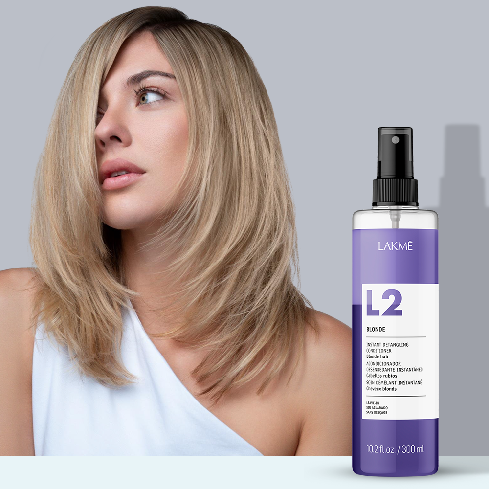 Двуфазен балсам без изплакване за руса коса LAKME L2 с pH 3.5 – за мигновено подхранване и блясък. Подобрена формула, същото емблематично действие.