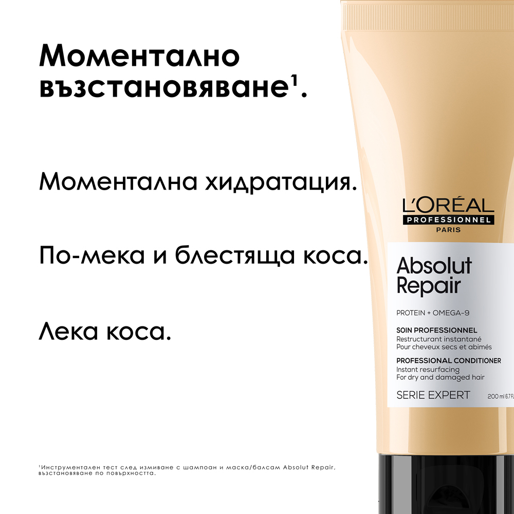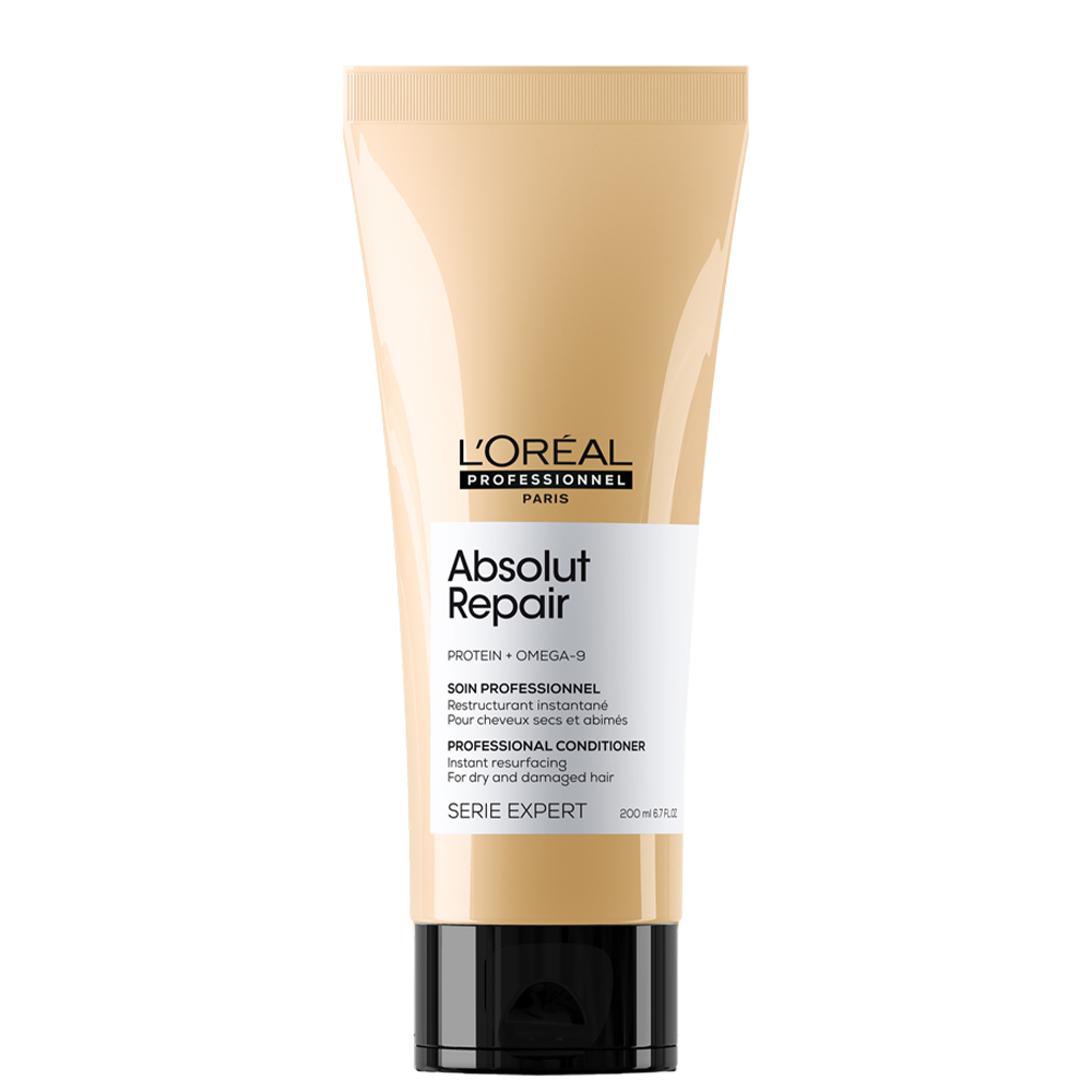Продуктите от серията Absolut Repair Gold съдържат иновативна формула за възстановяване на повърхността на косъма, която не утежнява косата. Те се грижат за косата, благодарение на съставките си, екстракт от златна киноа и пшеничен протеин, за моментално преобразяване на косата. Косата е моментално възстановена, мека и блестяща. Без утежняване.