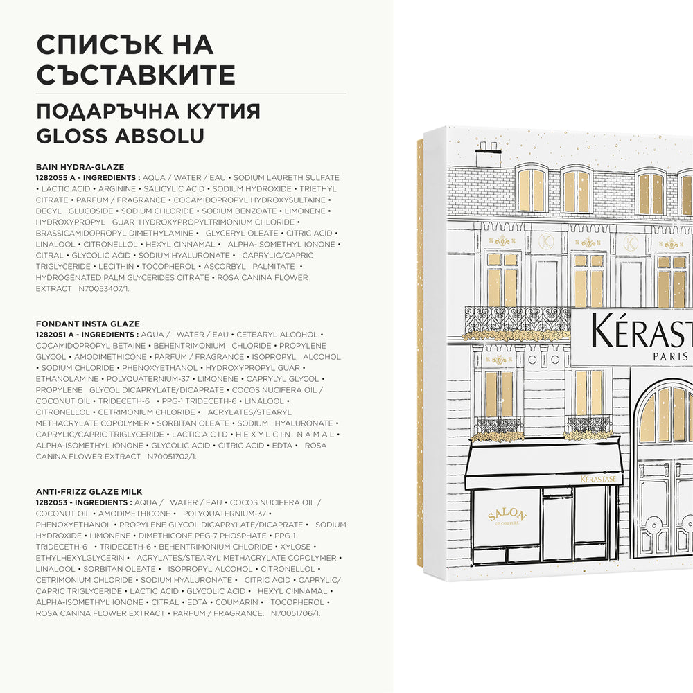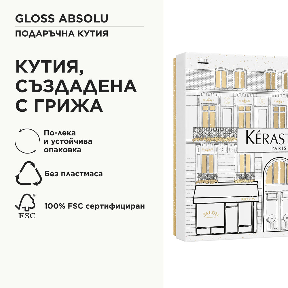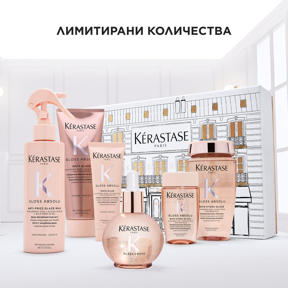 Постигнете мечтата си за сияйна, обемна и гладка коса със серията Gloss Absolu – първата хидратираща грижа на марката Kérastase, която придава кристален блясък на косата. Комбинацията от тези продукти осигурява 360° кристален блясък и гладкост за всеки тип коса. Специалната технология Hydra Glazing в серията се допълва от мощни киселини за действие – хиалуронова и гликолова киселина, както и екстракт масло от дива роза, от цветовете на рози, отглеждани във Франция. Косата е интензивно почистена, хидратирана, мека и гладка, за максимален блясък и сияйност.