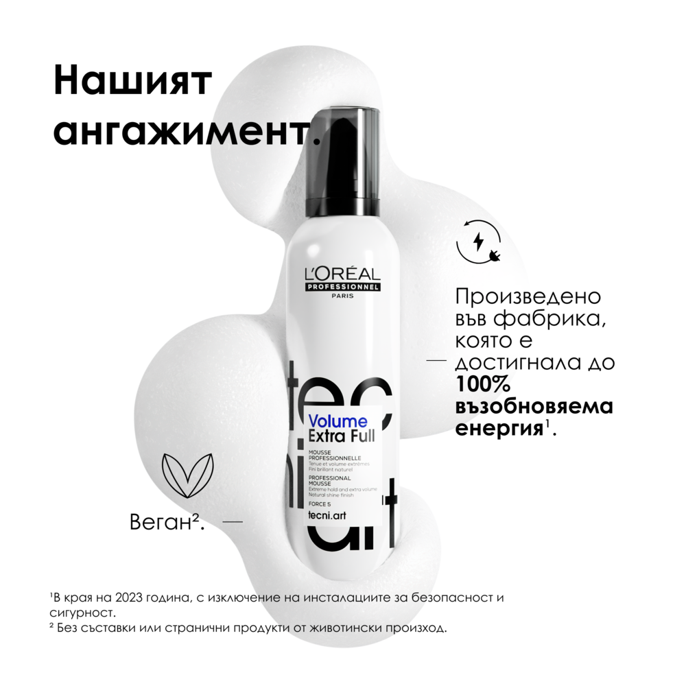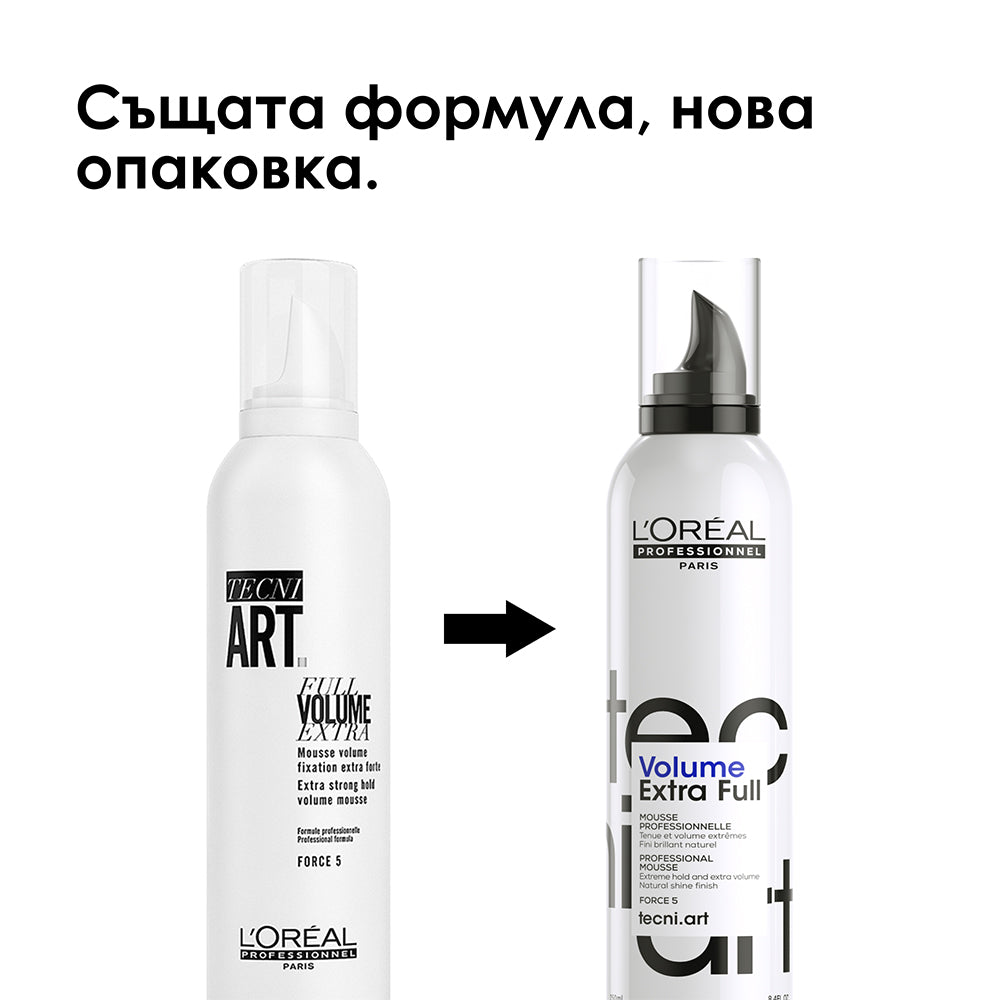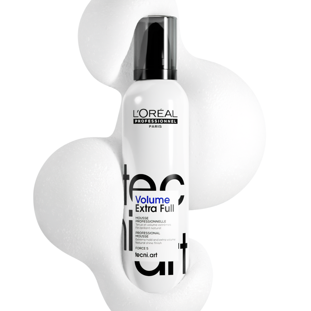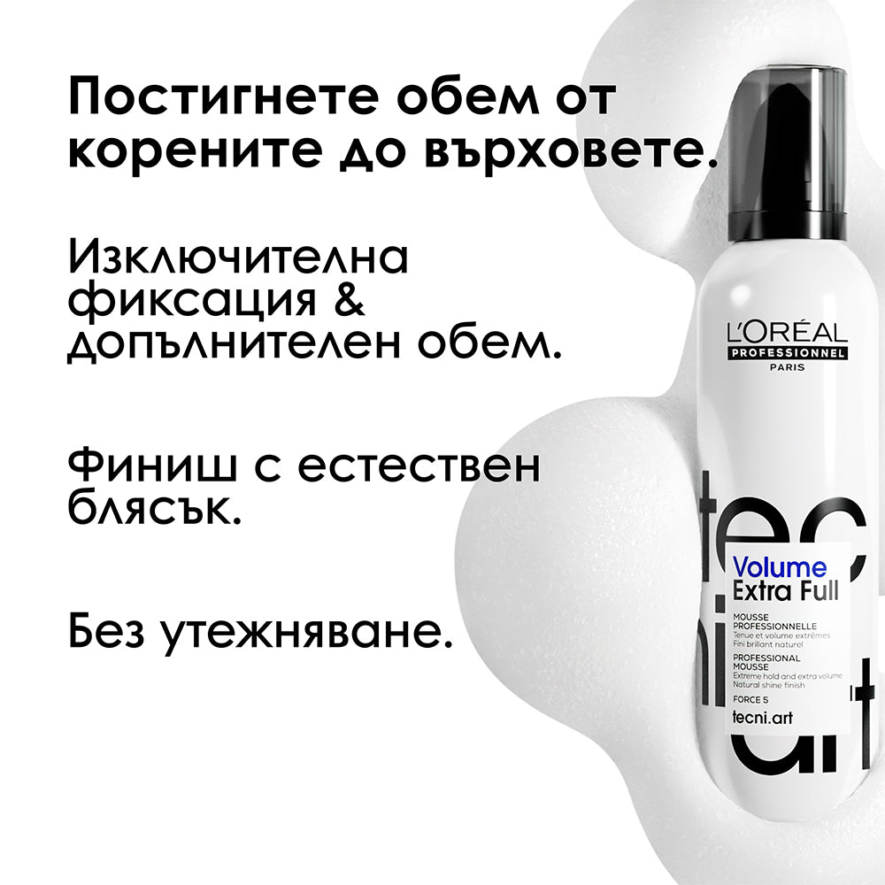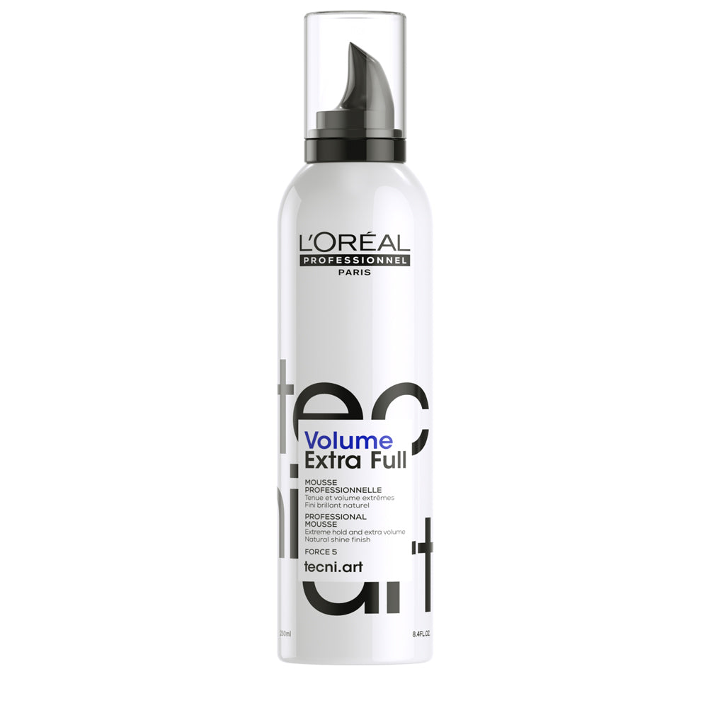 L'Oréal Professionnel Tecni Art Volume Extra Full е пяна за супер обем и силна фиксация. Помага ви да създадете допълнителен обем, фиксира прическата, без да я утежнява и без ефект на втвърдяване. Подходяща е за всички типове коса. Подходяща за обемни прически, визии с опашки и плитки.