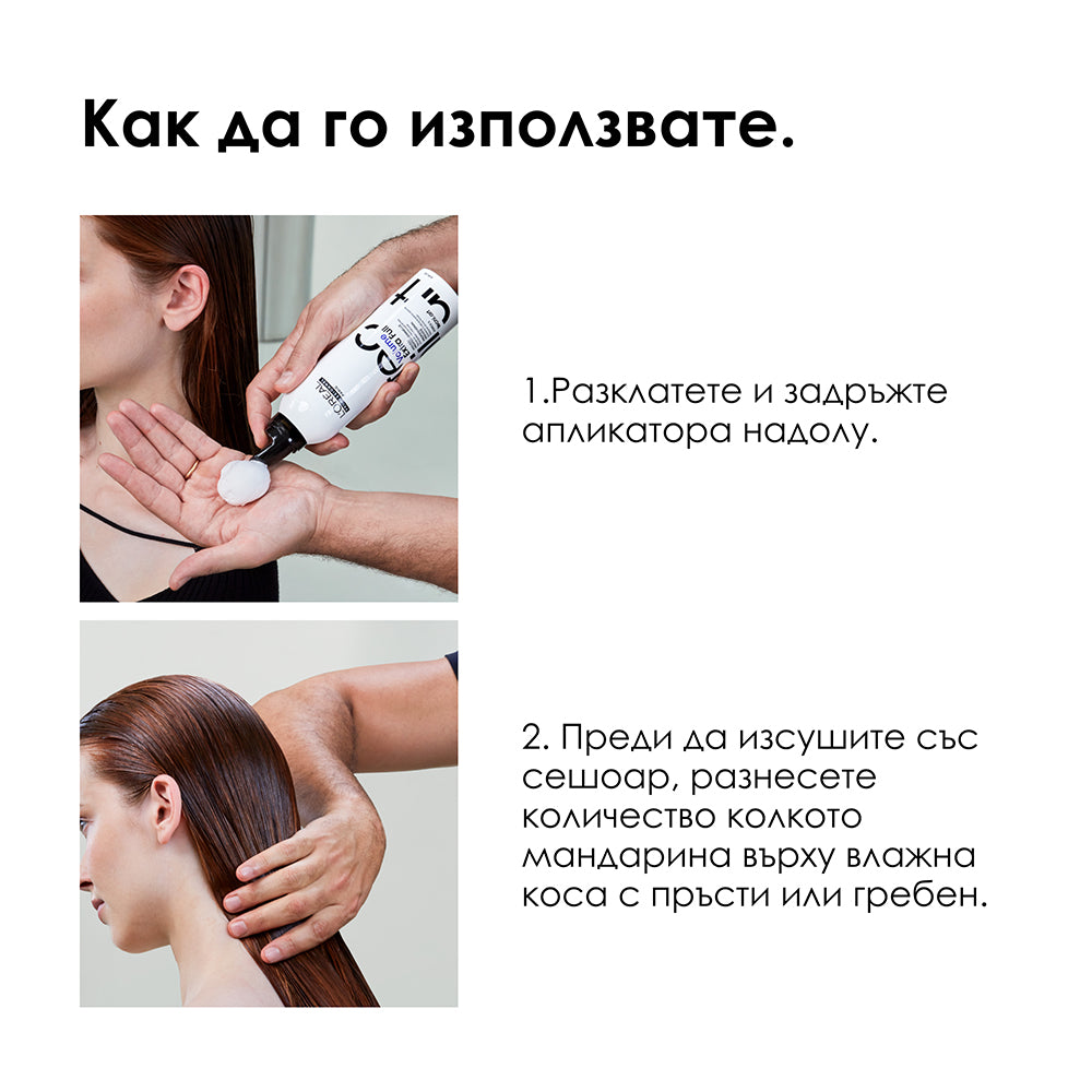 Начин на употреба: За да използвате, разклатете добре флакона, обърнете с дифузера вертикално надолу. Вземете количество колкото мандарина. Разнесете с гребен или пръсти, а след това изсушете със сешоар или оформете с пръсти.