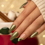 Маслинено зелено с метален блясък е уникален и стилен избор за цвят на маникюр през коледните празници. Този наситен, земен цвят носи уют и топлина, докато металният блясък придава на ноктите изтънченост и елегантност.