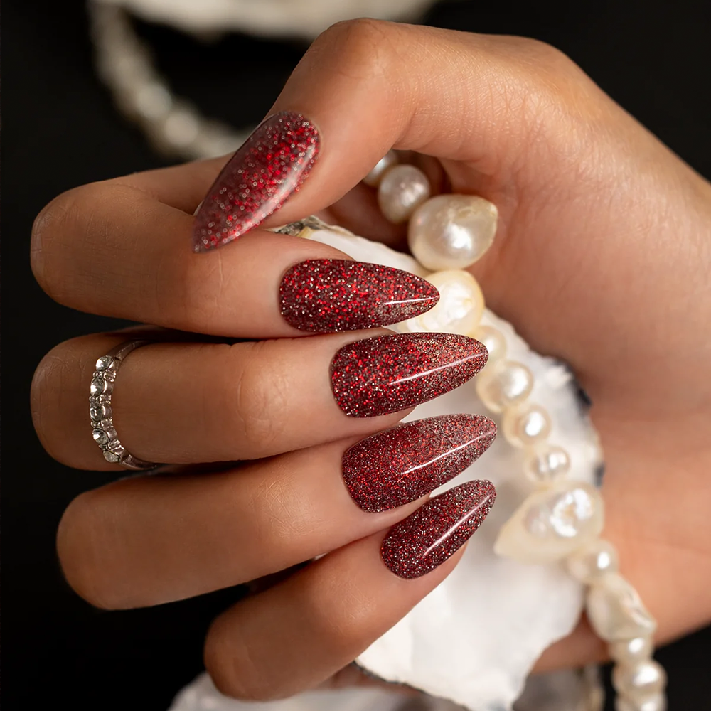 Яркочервен оттенък с елегантен сребърен тон за смел и забележителен маникюр през празничните дни.