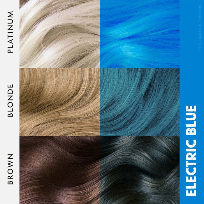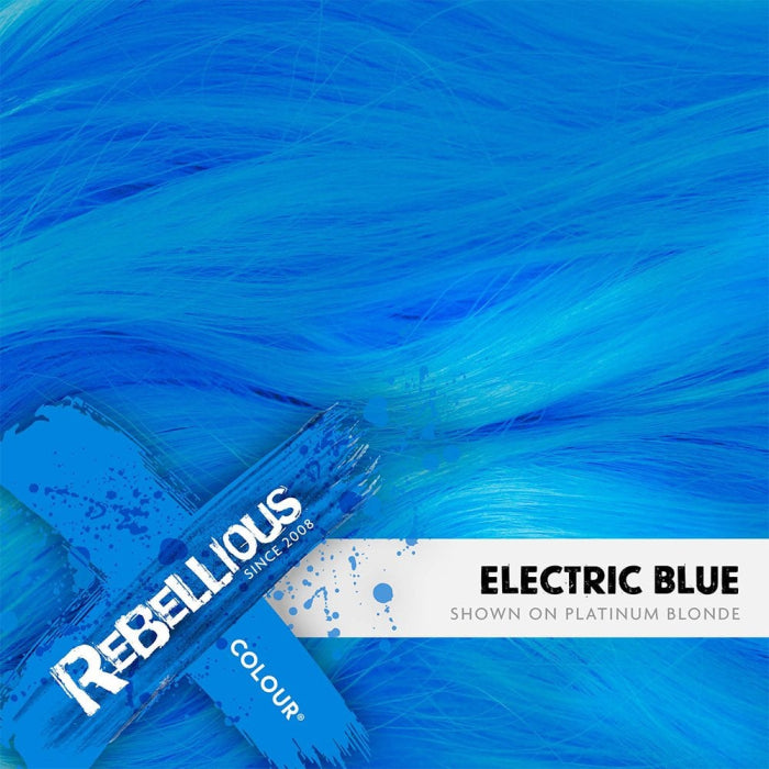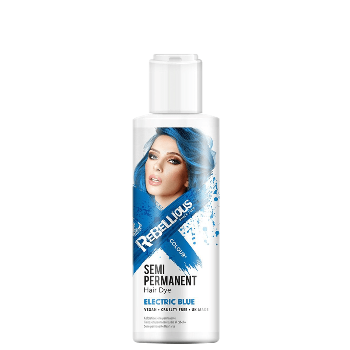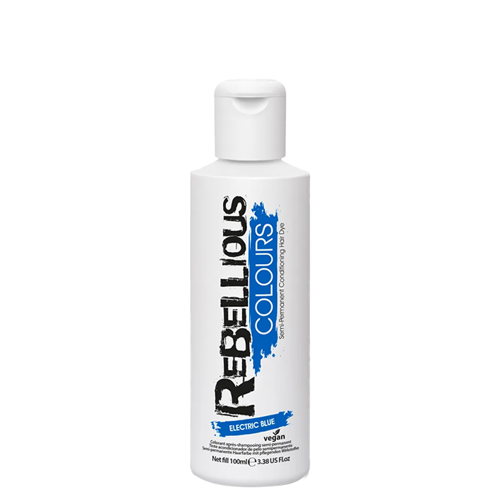 Боята Rebellious Colour Semi-Permanent Hair Dye Electric Blue придава ярък и наситен син цвят. Осигурява интензивна грижа по време на боядисването със своята хидратираща формула. Идеална е за постигане на екстравагантни визии с ярки цветове. Може да се използва върху цялата коса или за създаването на цветни кичури. Формулата без амоняк предпазва максимално косата, за да се избегне нарушаването на структурата й. Издържа 2 до 10 измивания. Това варира в зависимост от цвета, типа и текстурата на косата.