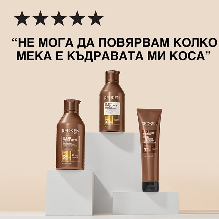 *базирано на потребителски тест при използване на пълната серия на Redken All Soft Mega Curls, която включва шампоан, балсам и крем за къдрици.