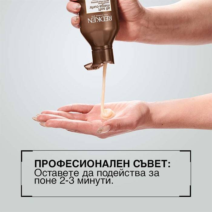 Препоръка: Използвайте комбинираното действие на всички продукти в серия All Soft Mega Curls на Redken, за да постигнете максимални резултати за вашата къдрава коса.