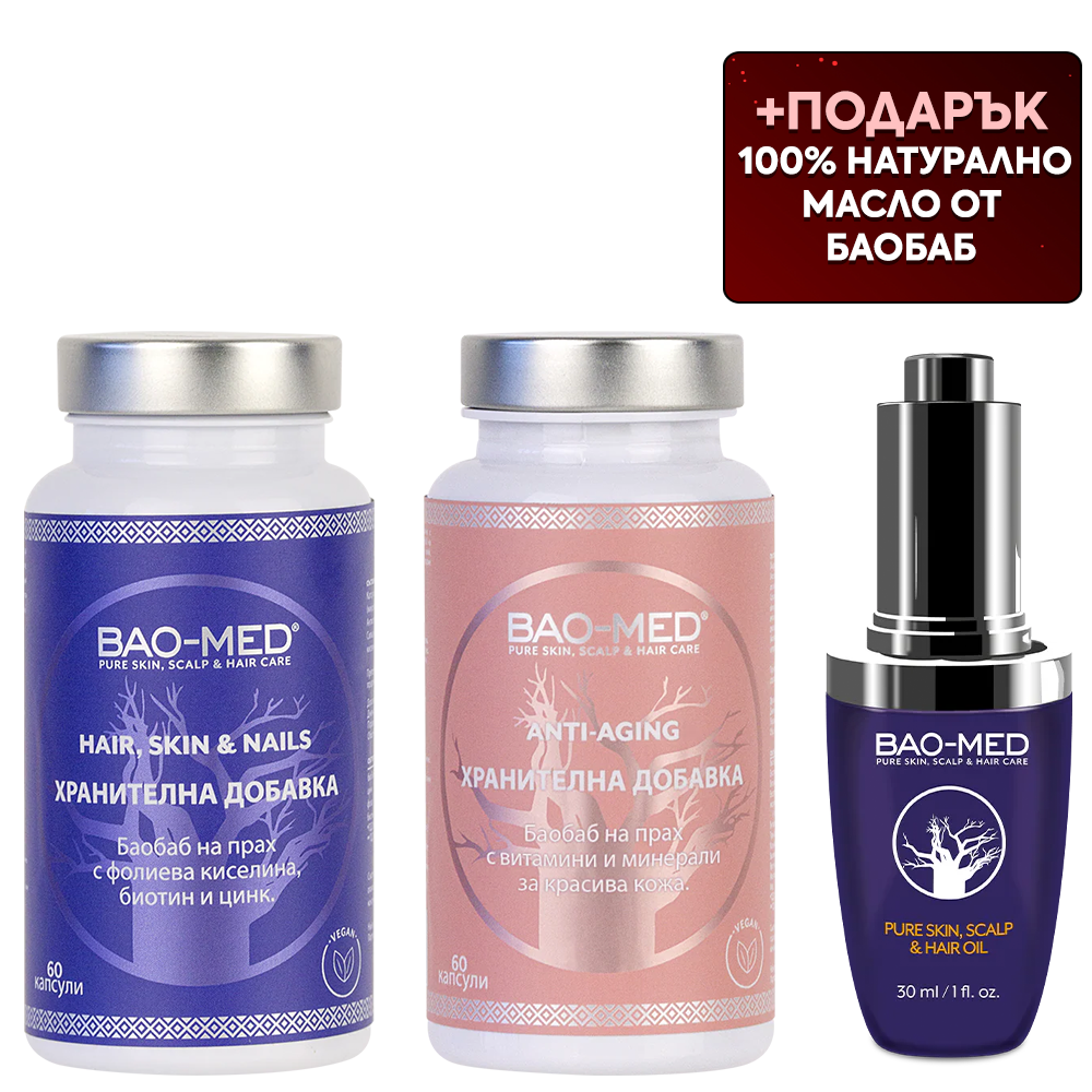 BAO-MED® е 100% натурално масло от баобаб, извлечено чрез студено пресоване, нерафинирано и със сертификат за органичен произход. Маслото има интензивно хидратиращо, подхранващо и възстановяващо действие върху кожата и косата. С богата златиста текстура, която оставя копринено усещане върху кожата.