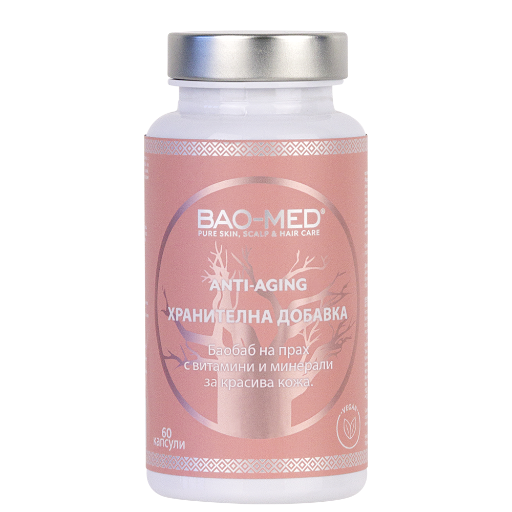 Анти-ейдж хранителни добавки BAO-MED Anti-Aging забавят процесите на стареене и поддържат красивия и здрав вид на кожата. Разработени със 100% веган формула и 13 високоефективни съставки с изключителни ползи за здравето на кожата. Приемът на капсулите подобрява функционирането на имунната система и чревната флора, като в резултат се повишава и способността на тялото да абсорбира витамини и минерали и да се бори с процесите по стареене. Капсулите осигуряват противовъзпалителен и антиоксидантен ефект, които повишават защитата на кожата от оксидативен стрес и външни агресори. Подпомагат правилното функциониране на клетъчния обмен и поддържането на здрави кожа и тяло.