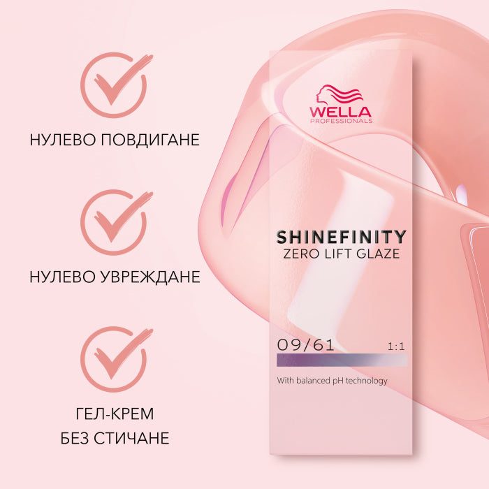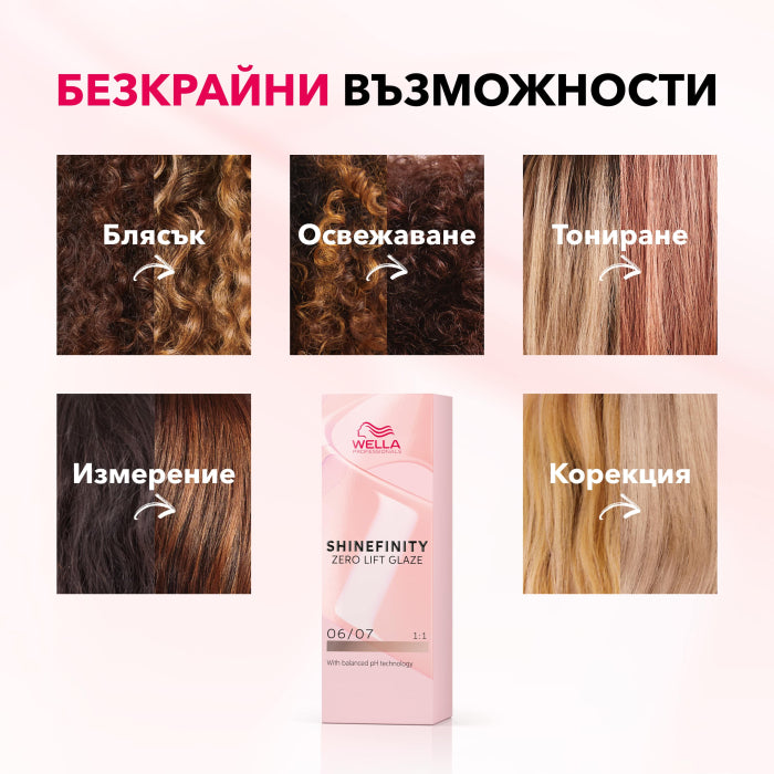 BALANCING GLAZE: перфектно допълнение за изравняване на дължините и краищата, докато използвате Koleston Perfect или Illumina Color върху корена. Нанесете боята върху корена по обичайния начин, оставете да действа за 10 минути, след което нанесете желания Shinefinity цвят по дължините и краищата. Време за действие на Shinefinity: 20 минути.