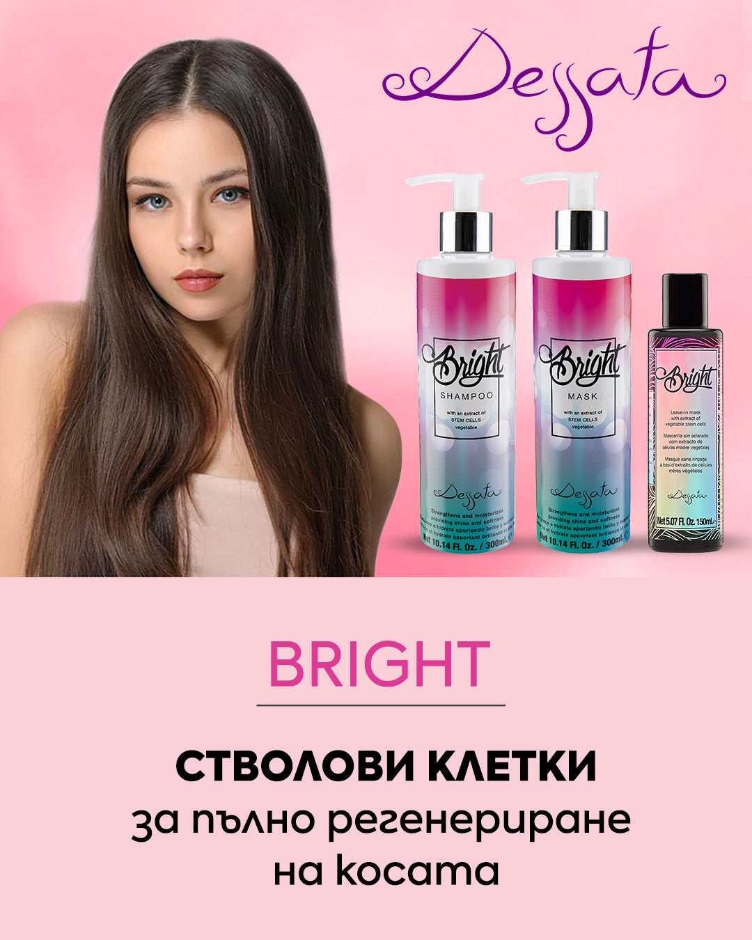 Серия Dessata Bright регенерира косата в дълбочина с помощта на растителни стволови клетки, които стимулират обновяването на космените фоликули и укрепват кератиновите връзки. Ефективна при увредена и трудна за разресване коса с фриз ефект.