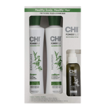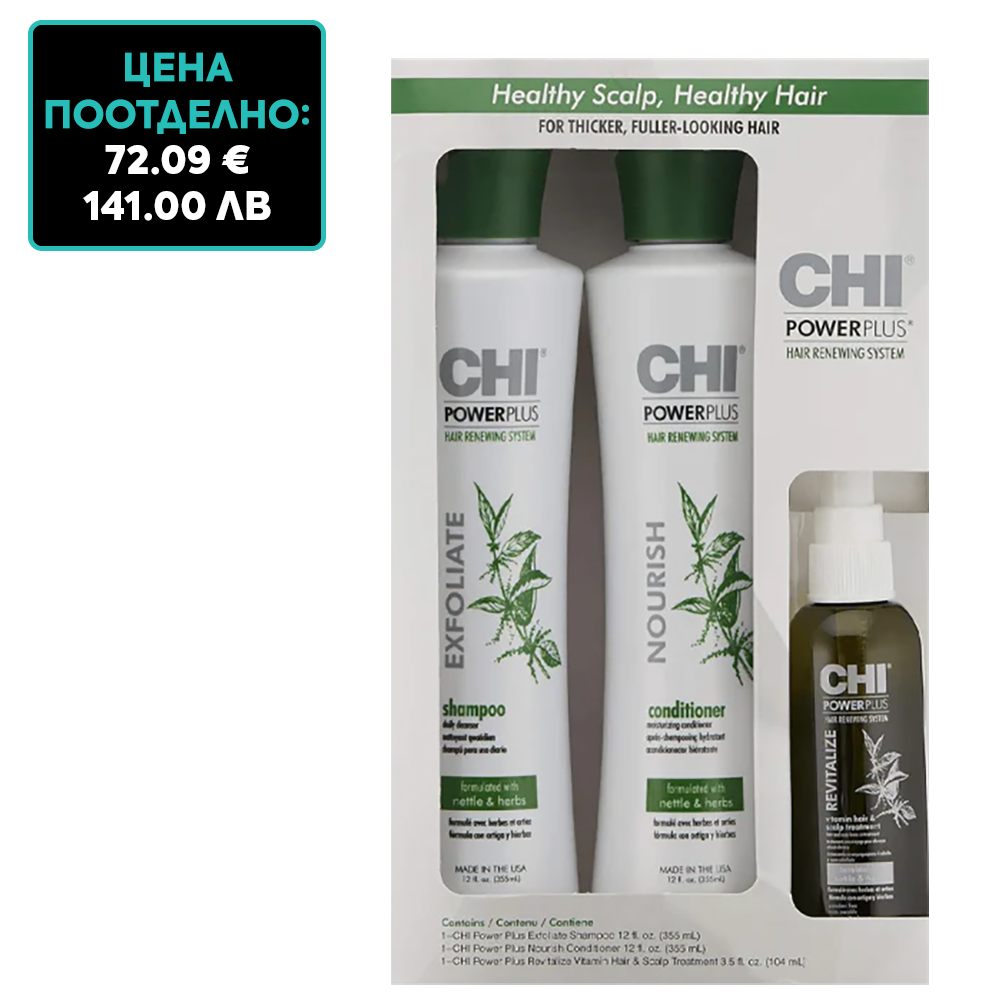 Обновяваща система за възстановяване на косата, специално разработена, за да полага основите на здравите коса и скалп. Ексфолира, подхранва и ревитализира скалпа, поддържайки го в оптимално състояние, за да стимулира растежа и уплътняването на косата. Системата за възстановяване на косата CHI Power Plus съдържа съставки от коприва, мента и богата смес от растителни продукти, които подхранват, облекчават стягане и сухота, като същевременно спомагат за балансиране и поддържане на скалпа. 3-степенната система предлага цялостна грижа за скалпа чрез ексфолиране, подхранване и съживяване на косата и скалпа.