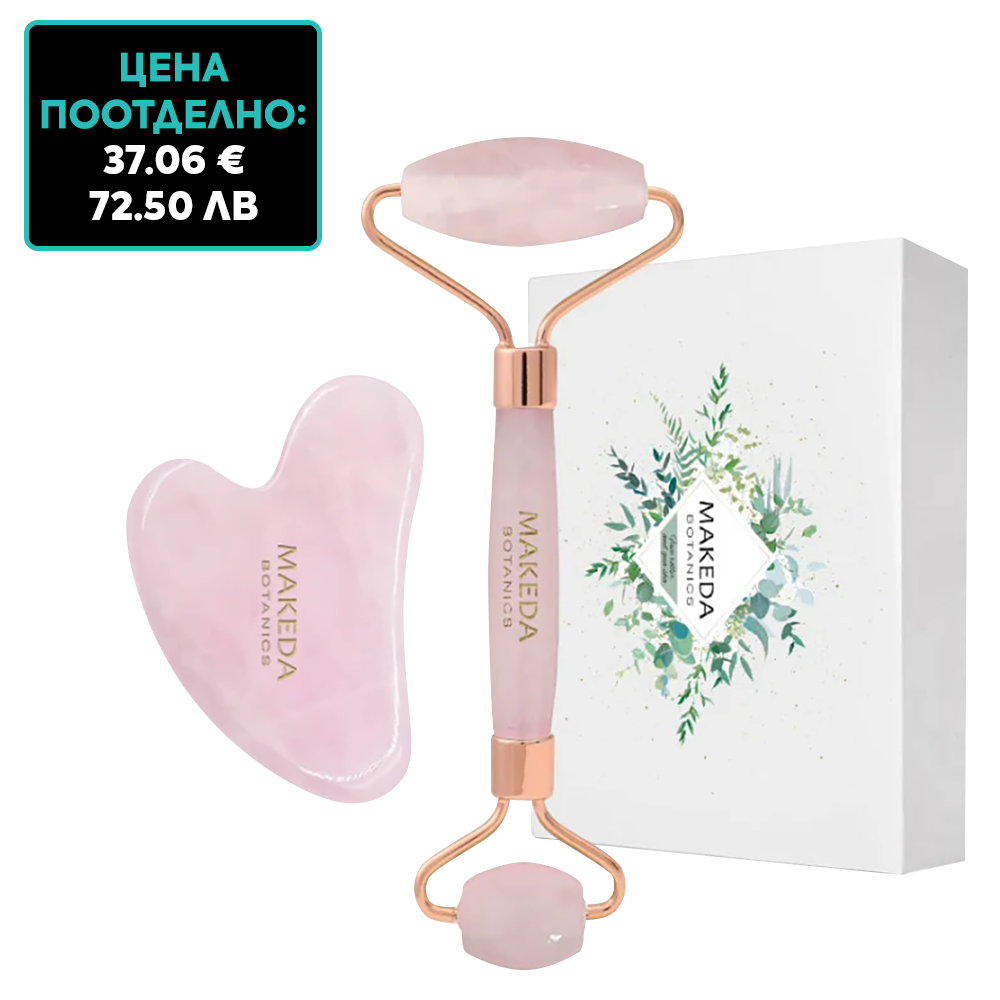 Комплектът ролер за лице и гуа ша MAKEDA Botanics са изработени от камък от розов кварц. Те стимулират кръвообращението и подобряват снабдяването на кожата с кислород, като по този начин подобряват еластичността, свежия вид и производството на колаген. Премахват признаците на умора като подпухналост и тъмни кръгове в зоната на очите.