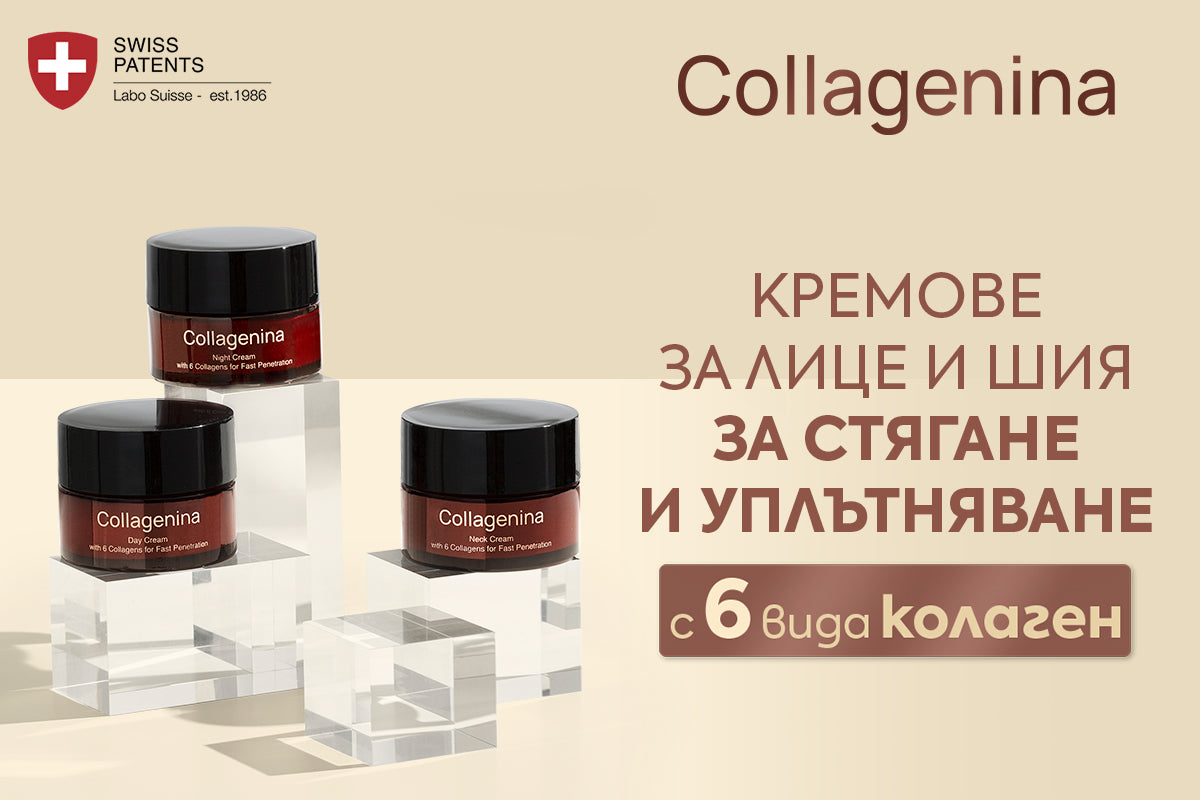 Collagenina Creams With 6 Collagens са стягащи и уплътняващи кремове за лиже и шия. Кремовете Collagenina са ежедневна терапия за стягане на отпуснатата кожа и лицевия контур, оформяне и възстановяване на нивата на колаген. С 6 вида колагена с различни молекулни тегла и допълнителни активни съставки за продължително стягащо и изглаждащо действие, които се използват сутрин, вечер и в специфичната област на шията.