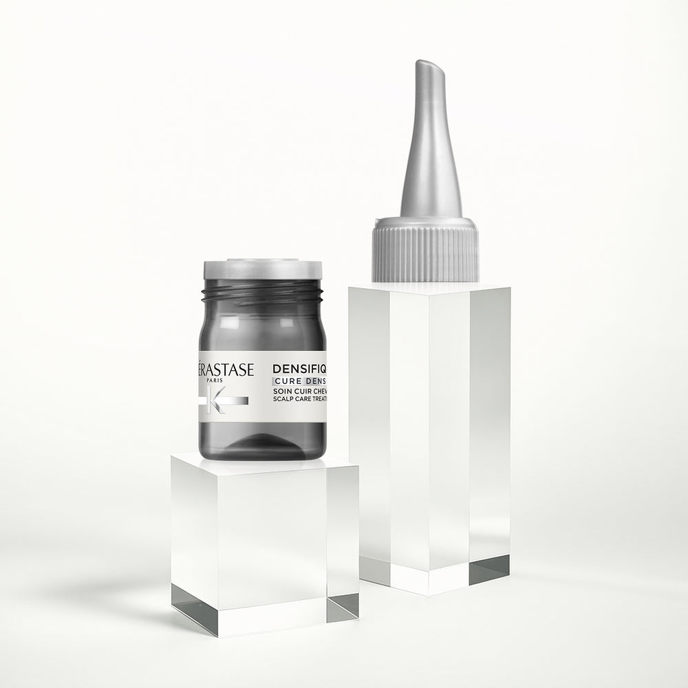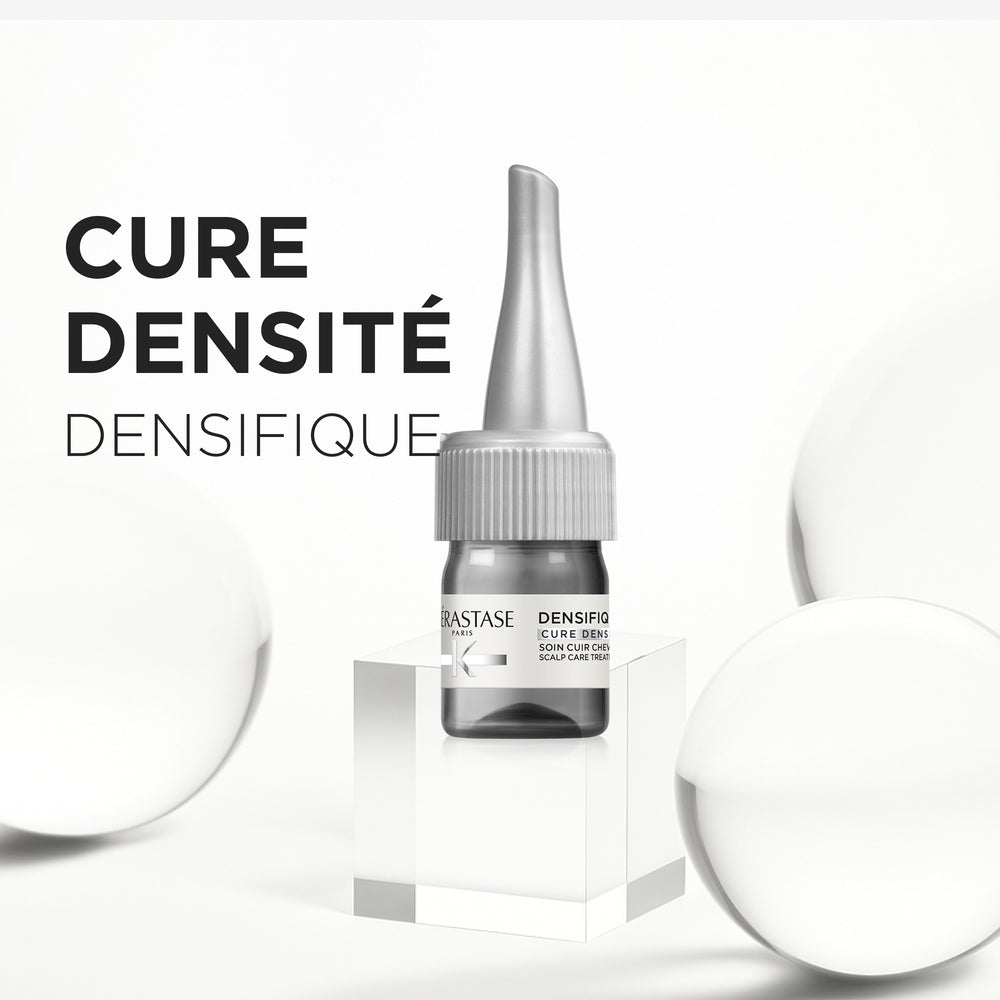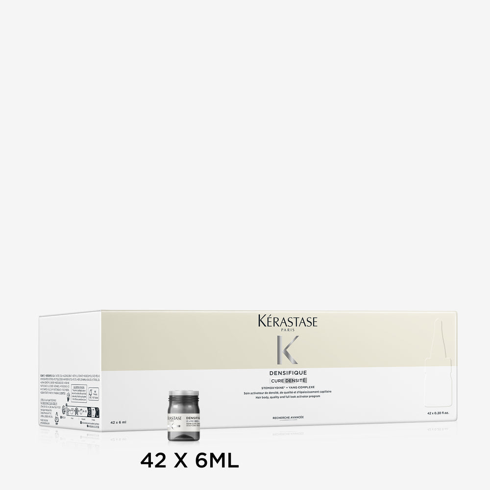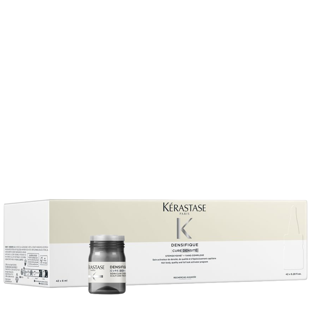 Програма за възстановяване и сгъстяване на косата Kerastase Densifique Cure Densité, обогатена със стемоксидин и янг комплекс. Грижа за коса, склонна към изтъняване с прозрачна течна текстура, която не утежнява и се абсорбира бързо.