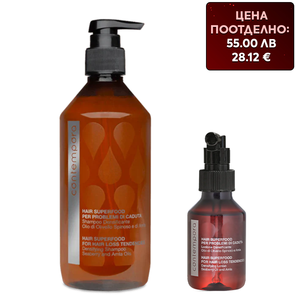 Densifying е суперхрана за сгъстяване на косата и против косопад. Заздравява и уплътнява структурата на косъма, като едновременно с това подхранва и стимулира жизнеността на “спящите“ фоликули. Формулата с доказано ефективни биоактивни съставки - облепиха и амла, стимулира растежа на косата, забавя процесите на стареене и балансира скалпа.