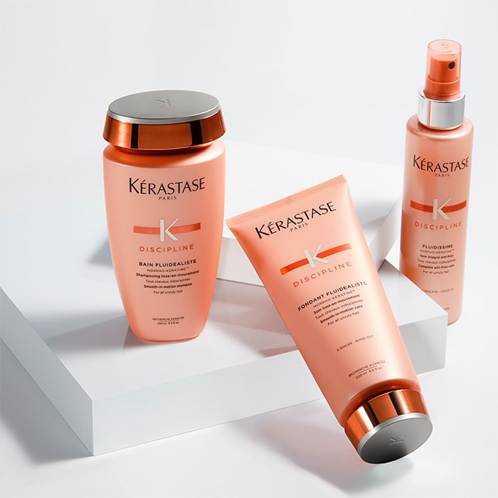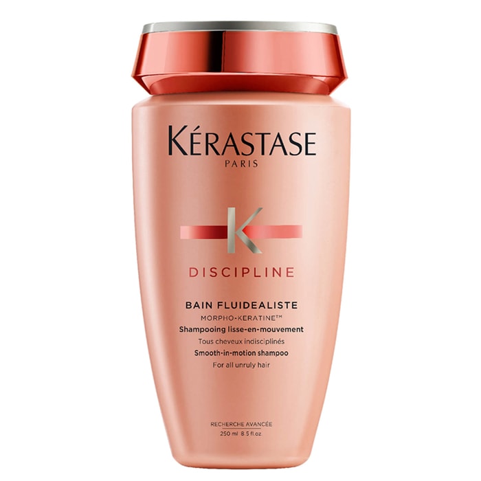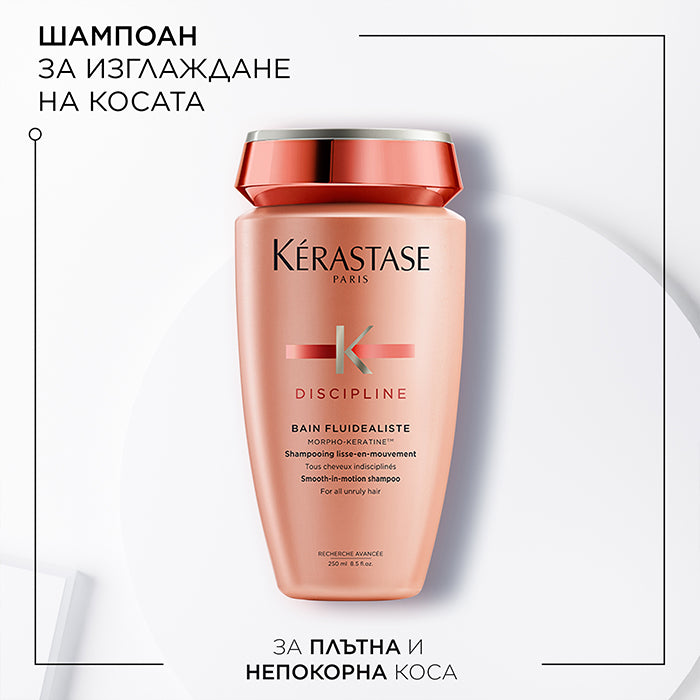 Шампоанът Kérastase Discipline Bain Fluidealiste създава богата пяна, която нежно почиства замърсяванията на косата. Неговата формулата опитомява непокорните коси като ги прави значително по-гладки и по-лесни за оформяне.