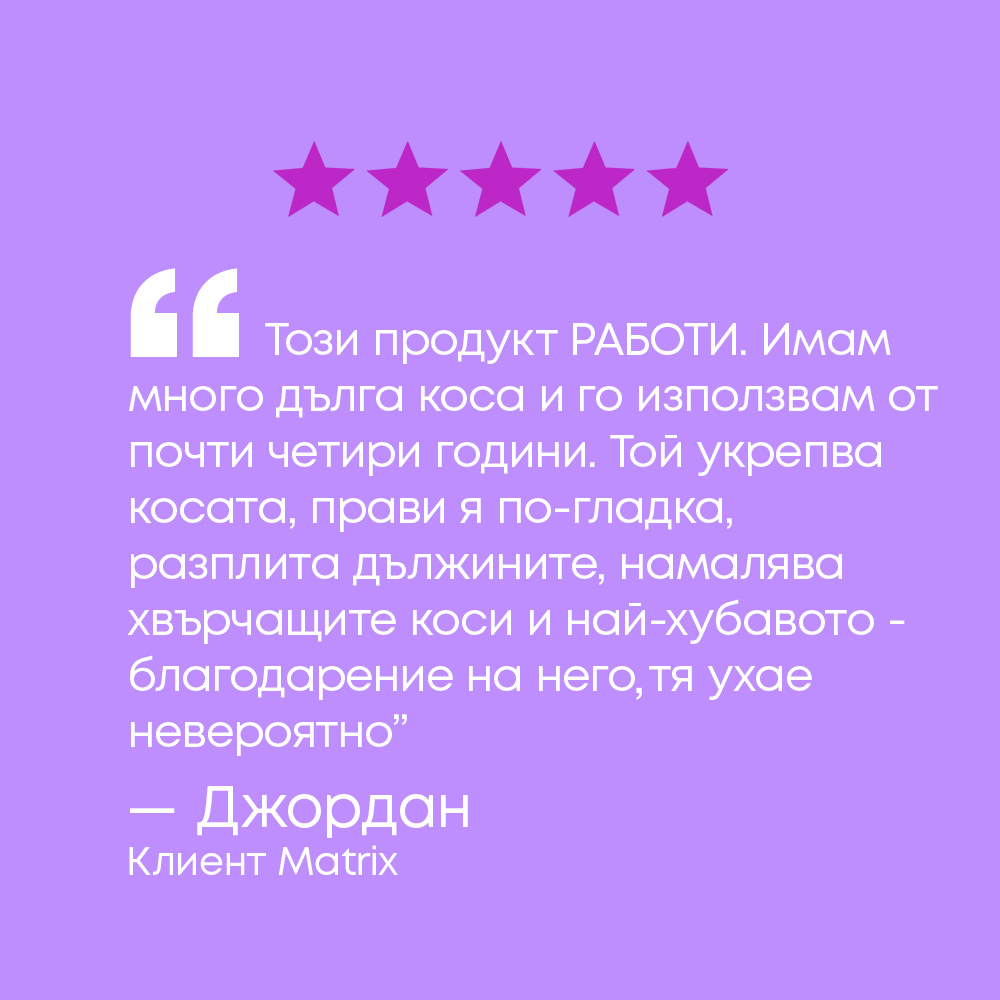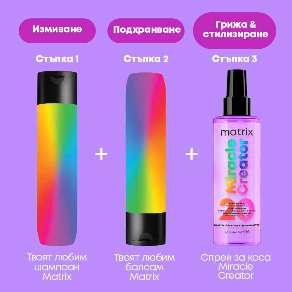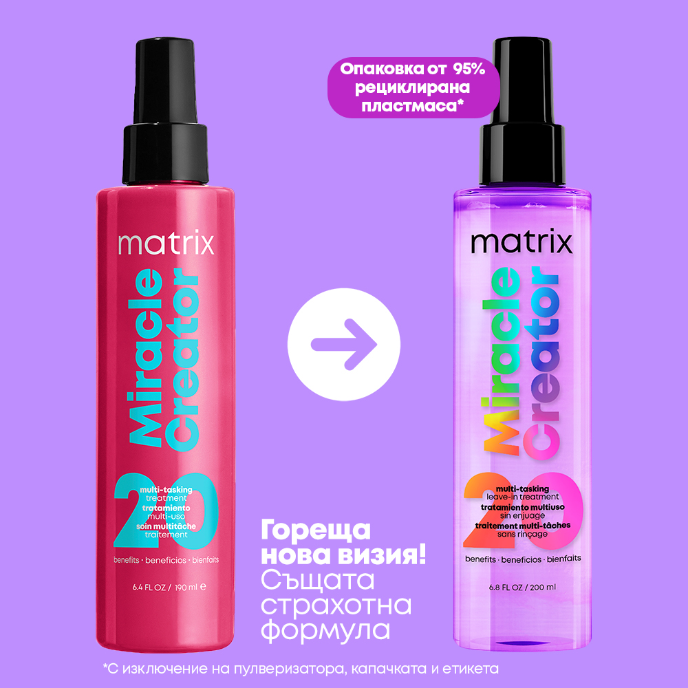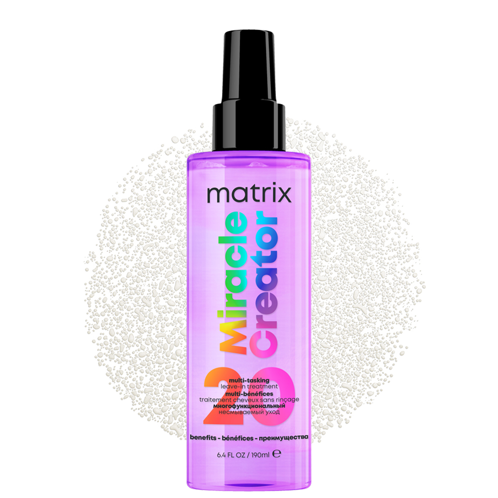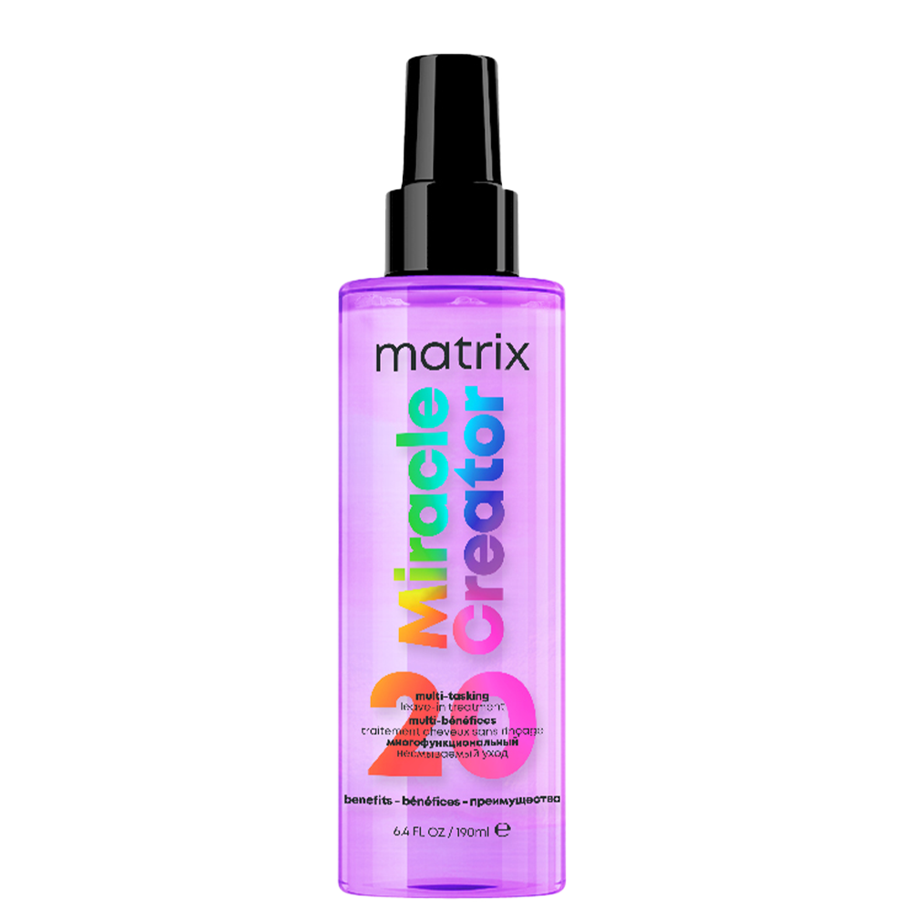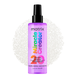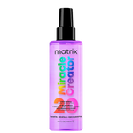 Matrix Miracle Creator Spray е многофункционална грижа за коса без изплакване с 20 различни ползи, която предпазва от топлина, осигурява силна и здрава на вид коса. Продукт, обогатен с млечна киселина, подхранващи и хидратиращи съставки, подходящ за всеки тип коса. Съдържа 3 подхранващи масла – кокосово, соево и бадемово масло, богати на омега мастни киселини, витамини и антиоксиданти, които проникват дълбоко в косата, за да я подхранят и предпазят от външни негативни фактори и да заключат блясъка. Млечната киселина – основен вид алфа хидрокси киселина (AHA), изглажда и хидратира косъма, което помага за подсилването му. Активните съставки ацетамид и лактамидни МЕА привличат влага от въздуха, за да придадат мекота, блясък и плътност и да улеснят разресването и оформянето на косата.