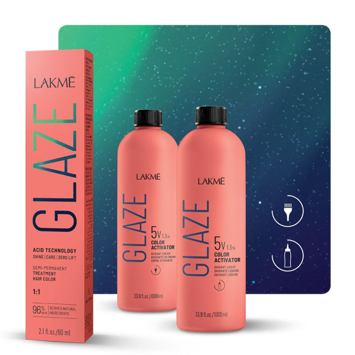 Активаторът за боя GLAZE 5V (1.5%) е формулиран с киселинно pH, съобразено с нуждата от развитие на цвета и гарантиране на избрания тон, без изсветляване на естествения пигмент.