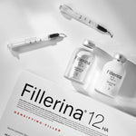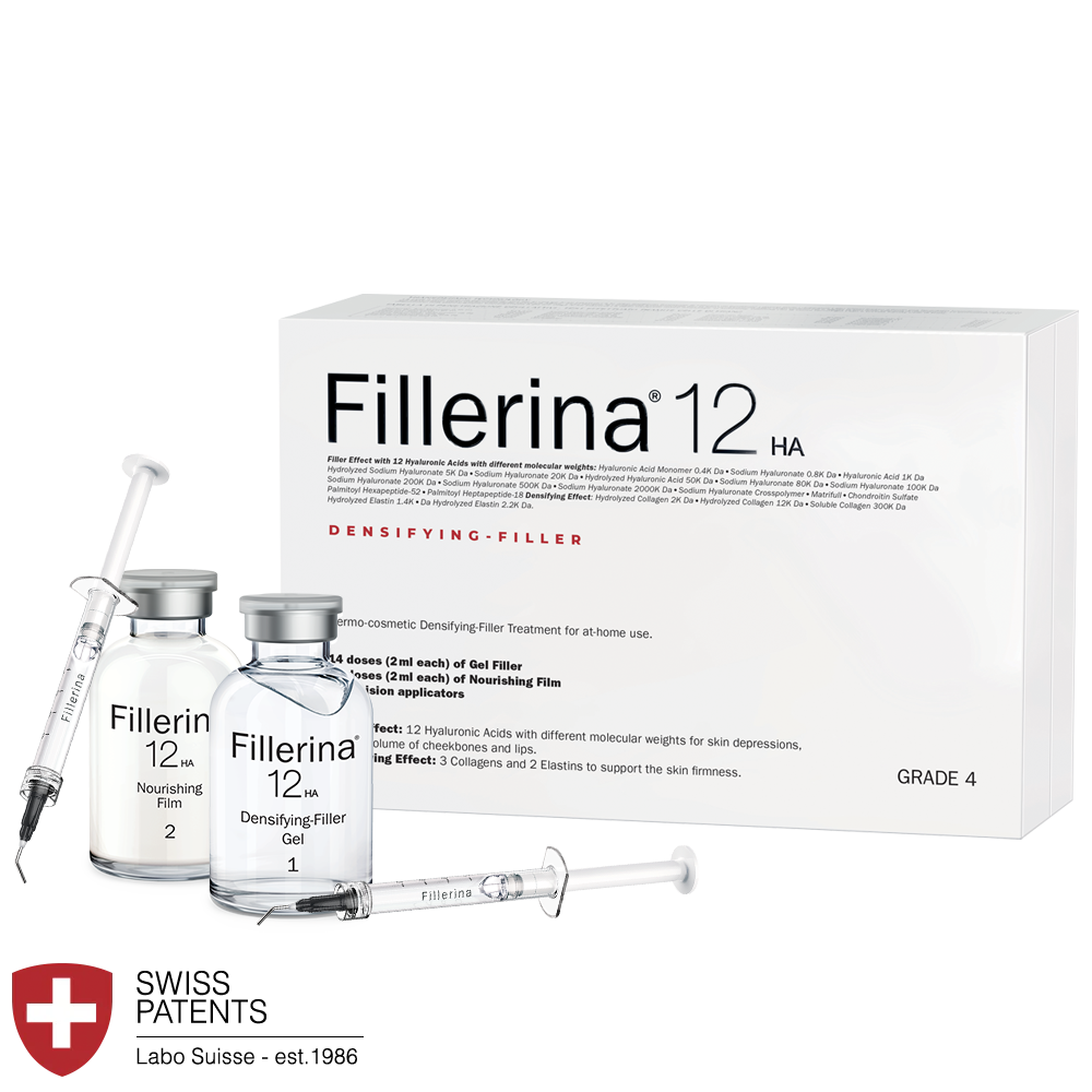 Уплътняващата филър терапия с хиалуронова киселина Fillerina 12HA Densifying-Filler Intensive Treatment е дермо-козметична филър терапия за употреба в домашни условия за външно приложение. С напредването на възрастта на кожата, количеството хиалуронова киселина постепенно намалява и причинява появата на възрастови бръчки, мимически линии и загуба на обем, които се изразяват в понижаване на плътността и увеличаване на линиите, особено в областта на скулите, бузите и устните. Терапията с уплътняващ филър Fillerina 12HA Ниво 4 за употреба в домашни условия работи в посока изглаждане на дълбоки бръчки и мимически линии, неравен микрорелеф и увиснала кожа. Помага за увеличаване на обема, плътността и пластичността на тъканите.