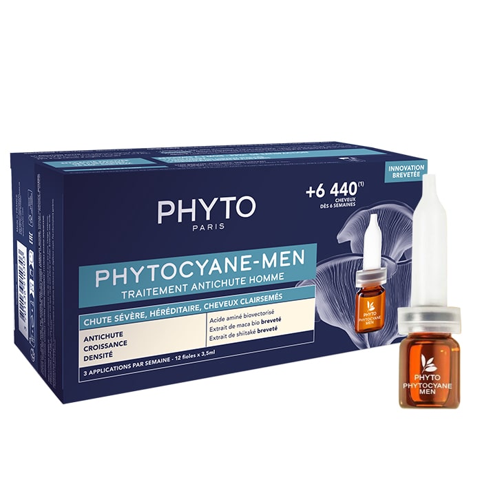 Иновативен продукт специално разработен против прогресивен косопад при мъже. Насочен към ограничаване прогресивната загуба на коса поради стареене или наследственост. Косопад, характеризиращ се с изтъняване на косата на определени места - слепоочия, отдръпнала се линия на косата, горната част на черепа, който продължава повече от 6 месеца. Новата формула на PHYTO с тройно действие стимулира растежа на косата, ограничава косопада и придава плътност и блясък. Комбинация от естествени съставки, която укрепва и заздравява, намалява загубата на коса, прави косата по-силна и активира растежа.