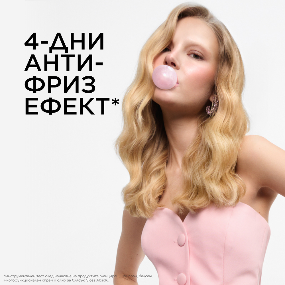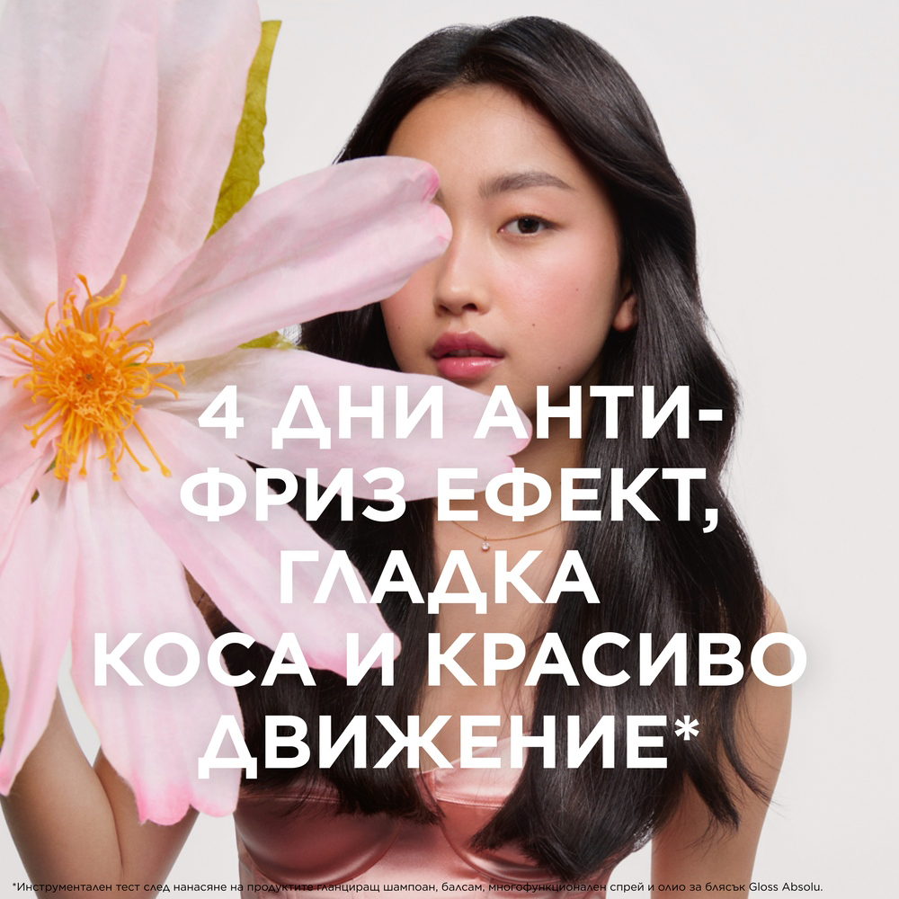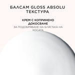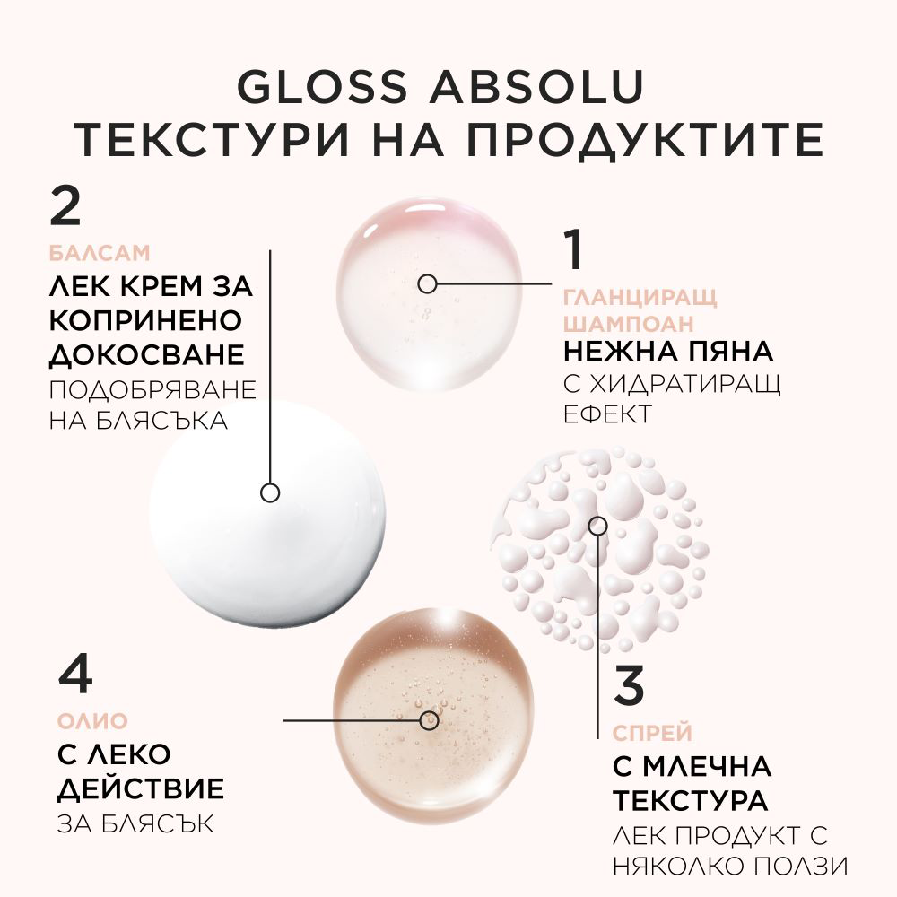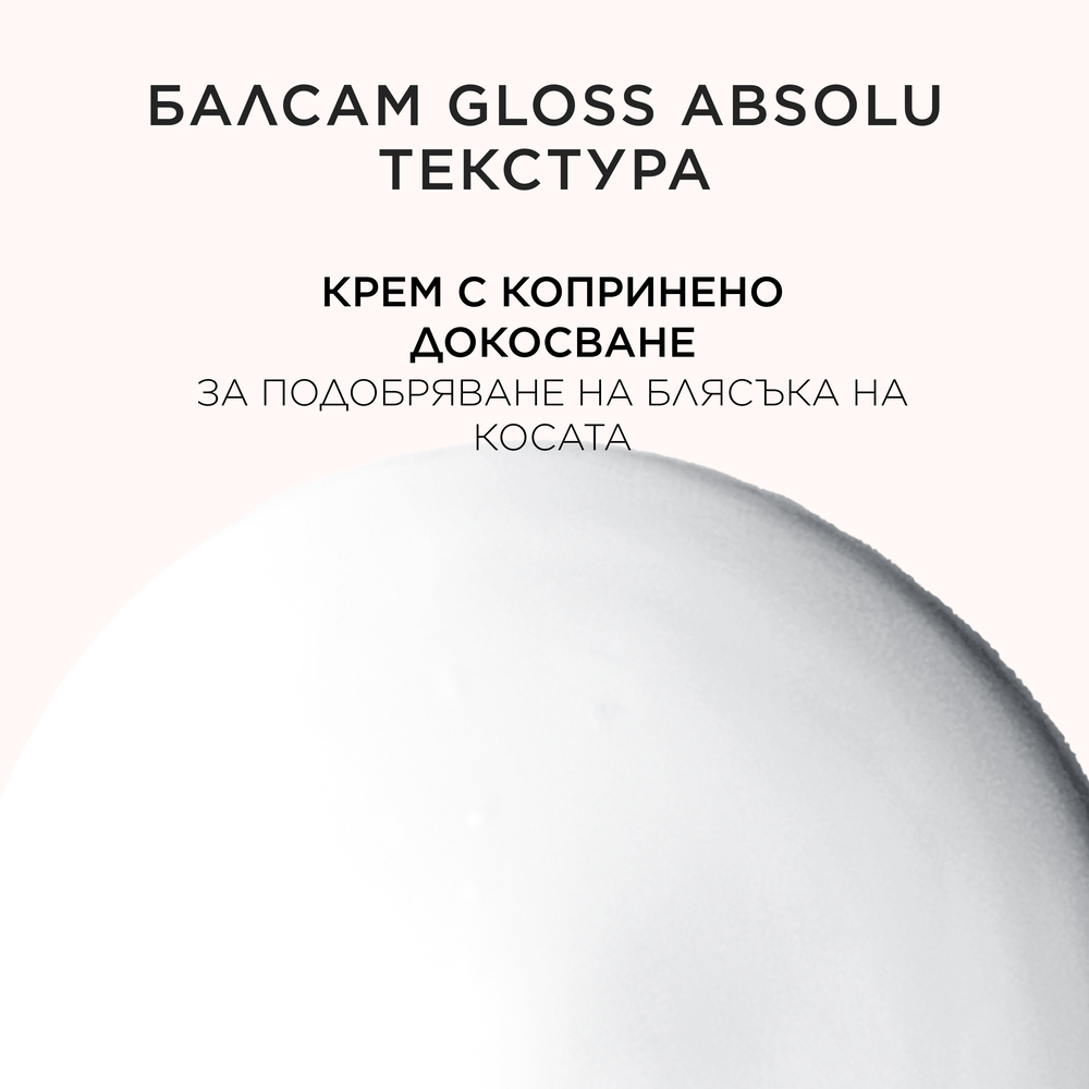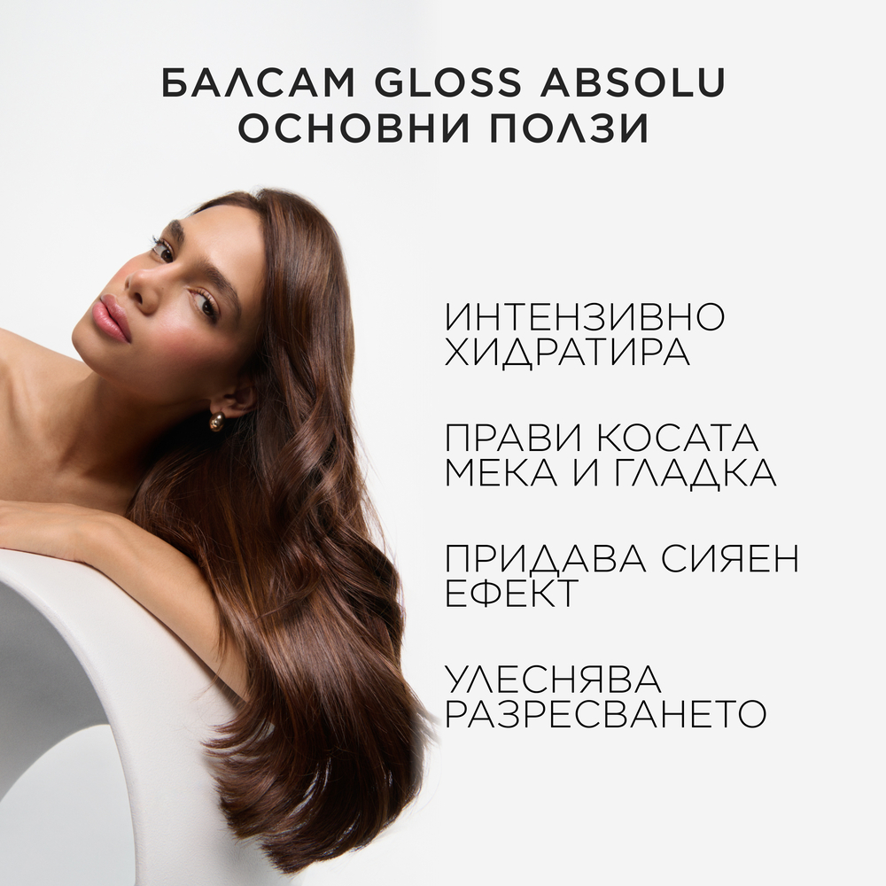 Балсам за коса Gloss Absolu, подходящ за всеки тип дълга и непокорна коса, обогатен с хиалуронова, гликолова киселина и масло от дива роза. Продукт с иновативна формула за придаване на гланциращ ефект на косата. Интензивно хидратира косата. Мигновено трансформира, създавайки гладка и равномерна повърхност за мека и гладка коса. Улеснява разлесването и усилва отразяващата способност на косата за постигане на сияен ефект.