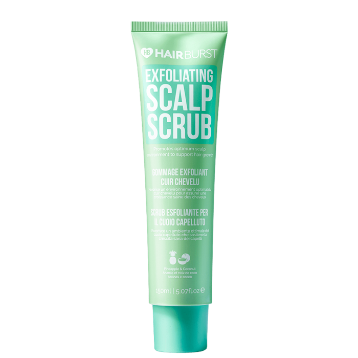 Hairburst Exfoliating Scalp Scrub е нежен скраб за скалп, който ексфолира и нежно премахва замърсяванията, натрупванията, праха и мъртвите кожни клетки от скалпа. Почиства скалпа в дълбочина и стимулира микроциркулацията и растежа на нова коса. Формулиран с гликолова киселина, която ексфолира химически скалпа, прасковена ядка, бамбукова пудра и захарна тръстика, които създават оптимална среда за растеж на косата.