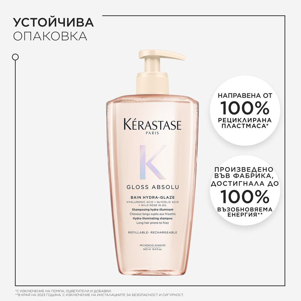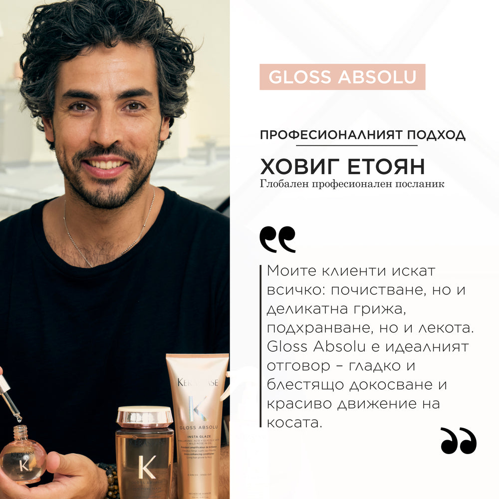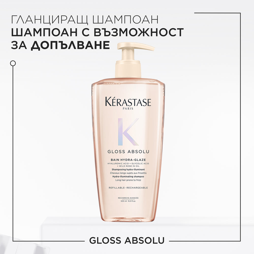 Серията Gloss Absolu със специалната технология Hydra Glazing е първата хидратираща грижа на марката Kérastase, която придава кристален блясък. Комбинацията от тези продукти осигурява 360° кристален блясък и гладкост за всеки тип коса.