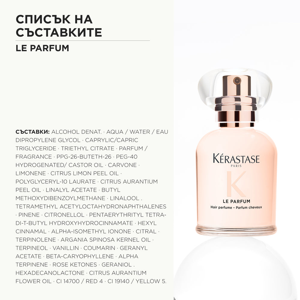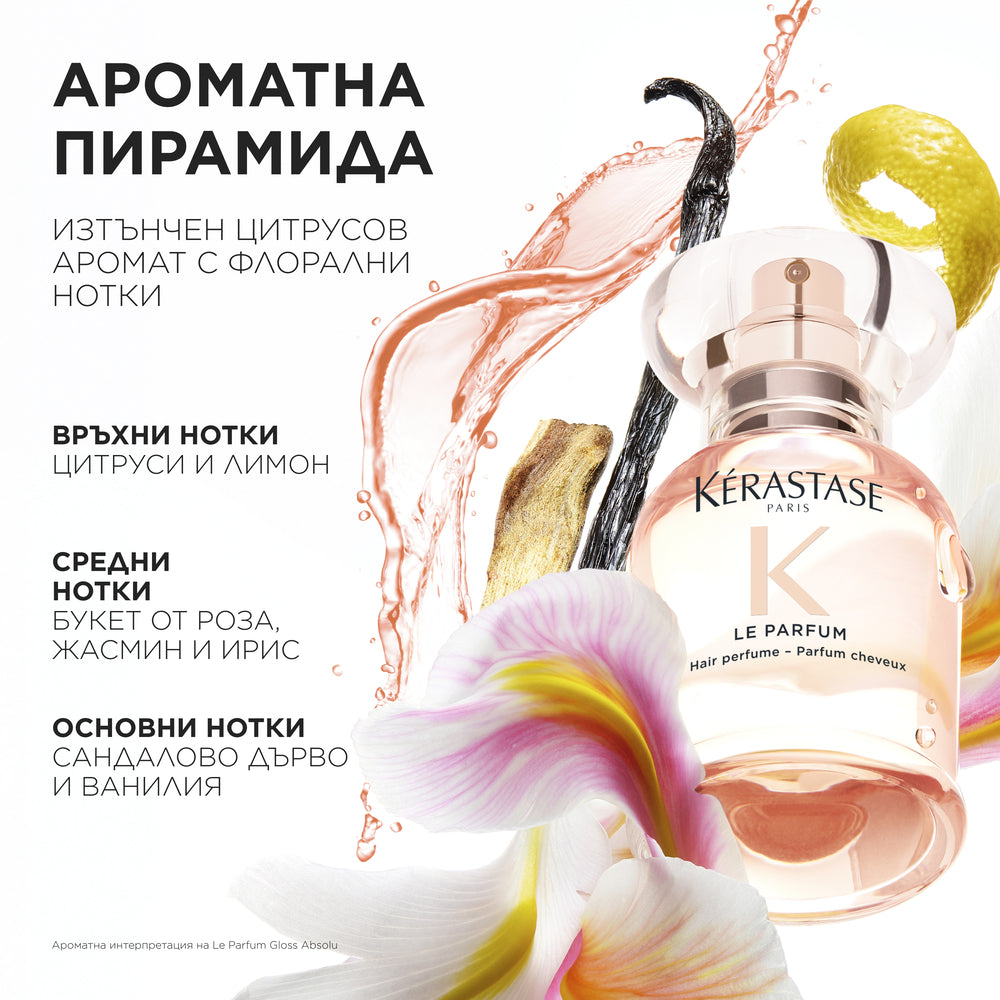 Парфюм за коса, който улавя изключителния аромат на серията Gloss Absolu. Kérastase Gloss Absolu Le Parfum е аромат от висшата мода, създаден от известните парфюмеристи Лоик Бишелие и Фабрис Пелегрин, който ободрява сетивата с неочаквана комбинация от изключително свежи цитруси и луксозен флорален аромат.