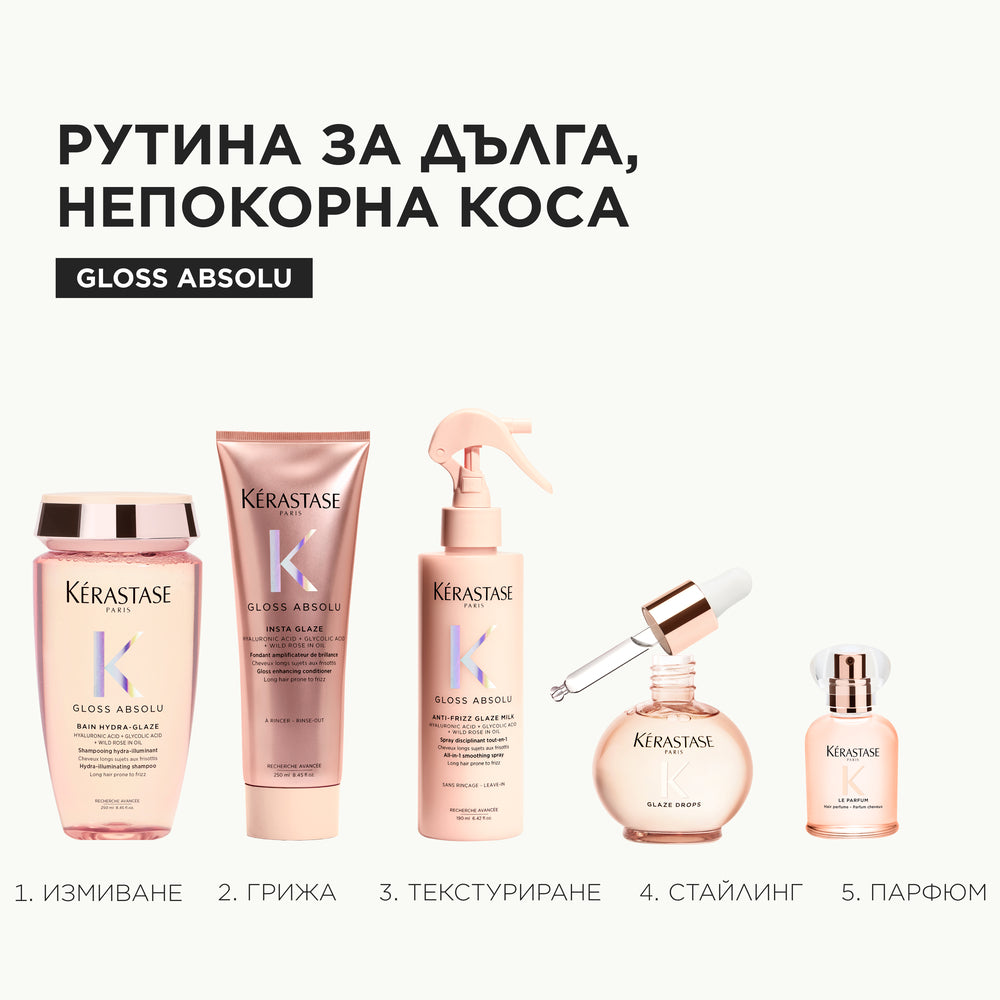 Постигнете мечтата си за сияйна, обемна и гладка коса със серията Gloss Absolu – първата хидратираща грижа на марката Kérastase, която придава кристален блясък на косата. Комбинацията от тези продукти осигурява 360° кристален блясък и гладкост за всеки тип коса. Специалната технология Hydra Glazing в серията се допълва от мощни киселини за действие – хиалуронова и гликолова киселина, както и екстракт масло от дива роза, от цветовете на рози, отглеждани във Франция. Косата е интензивно почистена, хидратирана, мека и гладка, за максимален блясък и сияйност.