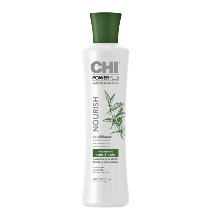 CHI Power Plus Nourish Conditioner е балсам с иновативна технология, формулиран с екстракт от коприва и активни ботанически съставки, който хидратира и стяга кожата на скалпа. Премахва усещането за сухота и опънатост и регенерира скалпа, като поддържа оптимално ниво на РН. Формулата му спомага за стимулиране на кръвообращението около космените фоликули, като насърчава оксигенацията на кожата и успокоява раздразнения на скалпа. Уникалната комбинация от съставки хидратира косата и връща жизнеността и енергията на сухата и изтощена коса. Укрепва и заздравява косъма и го предпазва от агресивното влияние на UV лъчите.