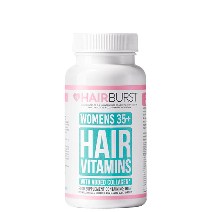 Hairburst Hair Vitamins for Women 35+ са научно формулирани витамини за коса, създадени специално за жени на възраст на и над 35 години. Колагенът в тялото намалява естествено с възрастта, което е и една от причините за изтъняване и отслабване на косата и космените фоликули. Формулата на витамините е създадена с аминокиселини, които са ключови за здравите коса и кожа. Цинкът, селенът и биотинът осигуряват видима разлика в здравината и усещането на косата при допир. Те поддържат косата в здравословно състояние, предотвратяват появата на накъсвания, както и стимулират растежа.
