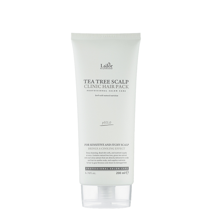 Успокояващата маска за коса La'dor Tea Tree Scalp Clinic Hair Pack помага за облекчаване на сърбежа на скалпа и появата на пърхот, като ексфолира и нежно отстранява мъртвите кожни клетки. Съдържа растителни екстракти от чаено дърво, зелен чай, алое и слуз от охлюви. Нежната формула доставя хранителни вещества на косата, за да придаде здравина и блясък. Ментолът оставя освежаващо усещане на скалпа след нанасяне. Салициловата и лимонена киселина ексфолират скалпа и намаляват производството на себум. Маслото от чаено дърво и листата на алое помагат за регенерирането на сърбящия и лющещ се скалп. Екстрактът от муцин помага за укрепването на косата от корена, регенерацията на клетките и успокояването на чувствителния скалп.