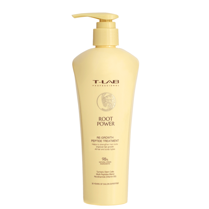 Маска за стимулиране на растежа на косата с пептиди T-LAB Root Power Re-Growth Peptide Treatment хидратира, подхранва, укрепва и стимулира растежа на косата. Формулирана със стволови клетки на куркума, които подобряват структурата на косъма, мултипептиден комплекс и ниацинамид, които предотвратяват косопада, укрепват косъма от корена и подобряват микроциркулацията на скалпа.