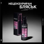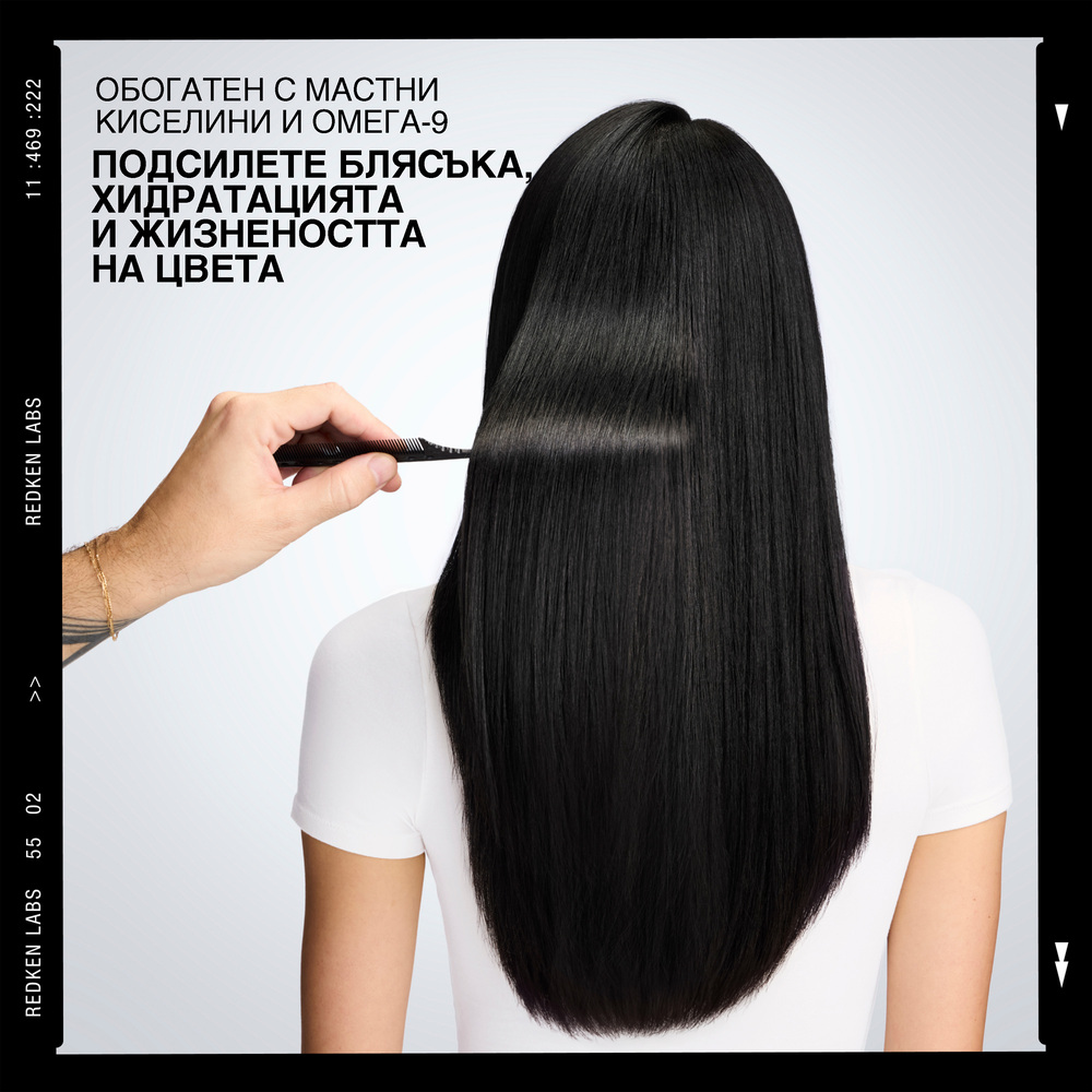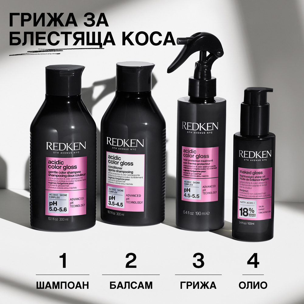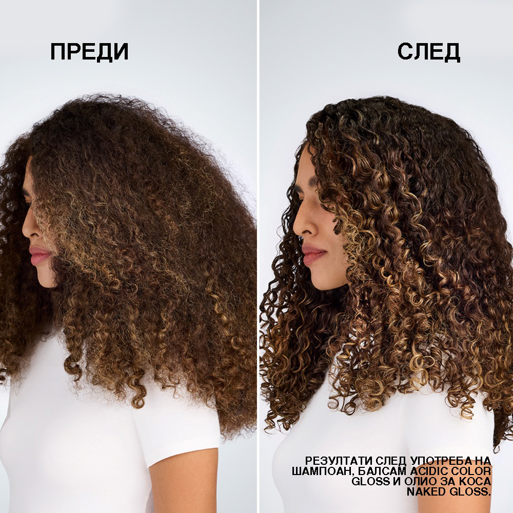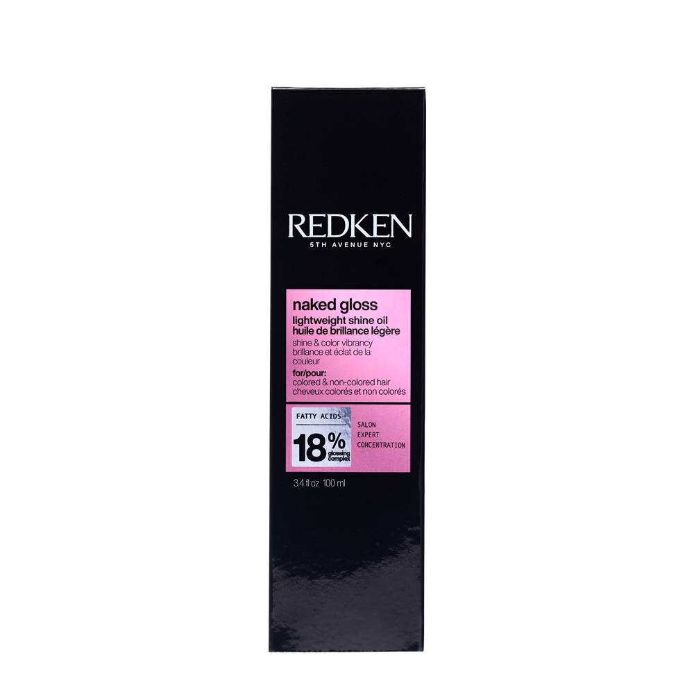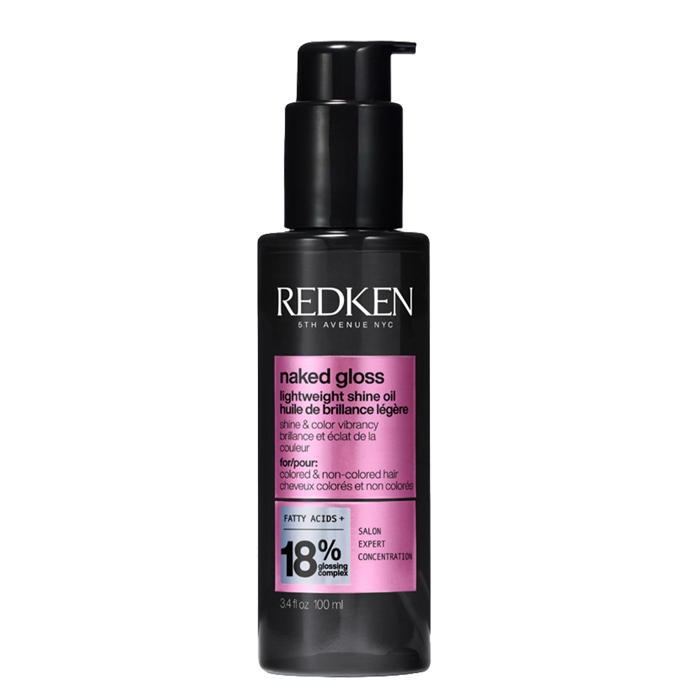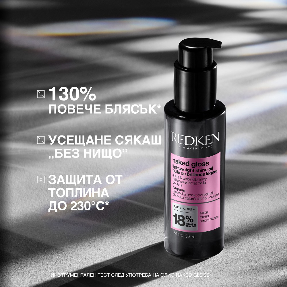 Олио за блясък с топлинна защита Redken Naked Gloss Hair Oil for Shine and Color Vibrancy. Предназначено е да запечата хидратацията в косата и да изглади косъма за максимален блясък на всеки тип коса. Попива моментално в косата, без да оставя следи и без утежняване, сякаш на нея не е нанесен продукт. Олио, обогатено с наситени мастни киселини и омега-9. Активните съставки – кайсиево масло и триглицериди – вид мастни киселини, подхранват косъма, за да увеличат гладкостта, хидратацията и блясъка. Осигурява 130% повече блясък* и усещане за лека коса. Предпазва косата от топлина до 230°C*. Най-лекото олио в гамата на Redken до този момент, попива моментално в косата без наслояване или утежняване. Действа интензивно, за да заглади косъма, да подсили блясъка, хидратацията и жизнеността на цвета. *Инструментален тест след употреба на олио за коса Naked Gloss.