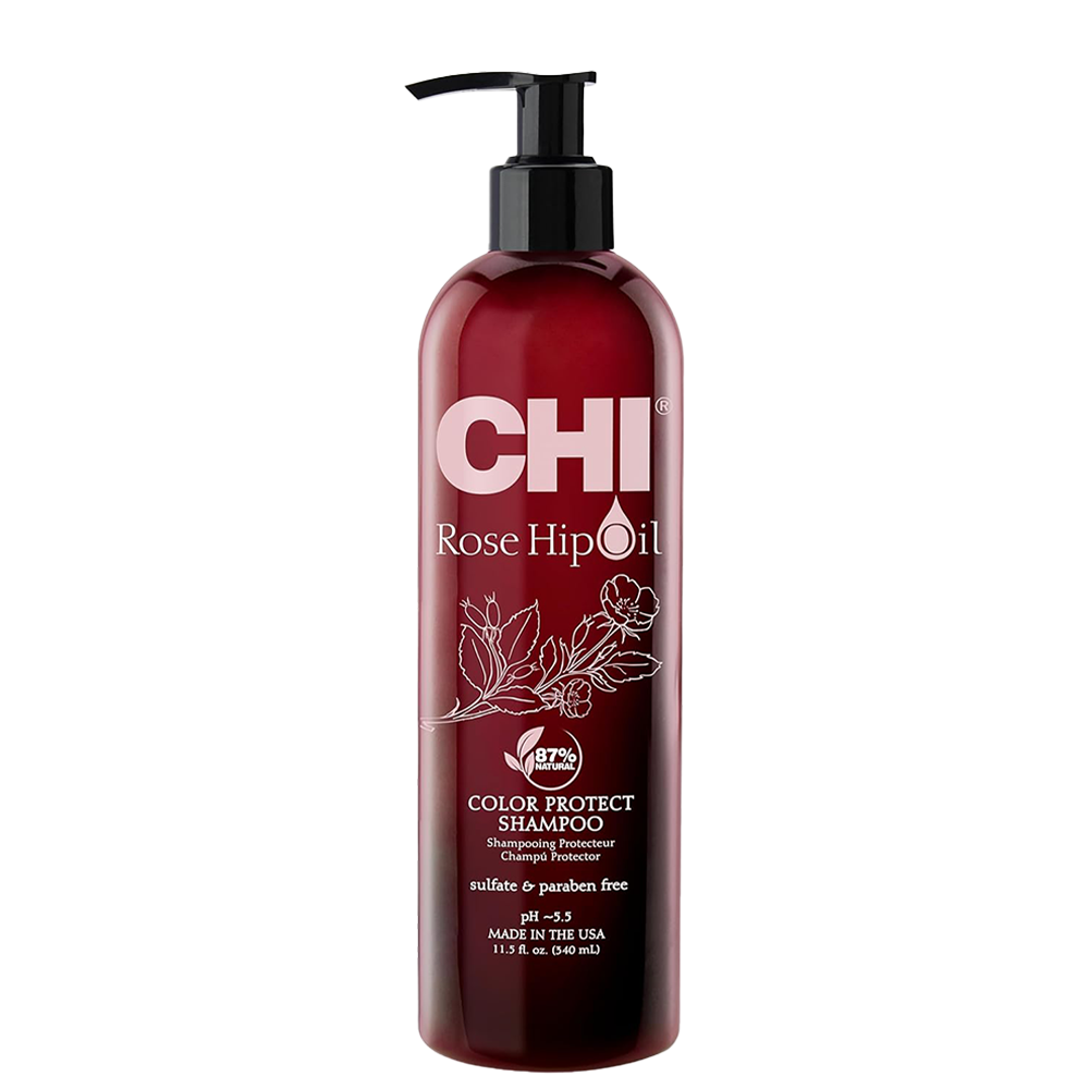 CHI Rose Hip Oil Protecting Shampoo е шампоан за боядисана коса, който осигурява максимален блясък и запазва цвета от избледняване.