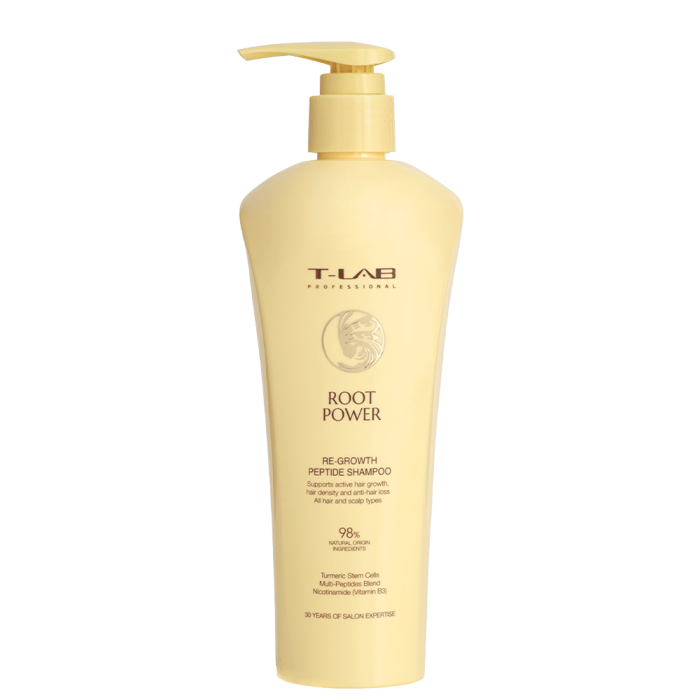 Шампоан T-LAB Root Power Re-Growth Peptide Shampoo нежно почиства скалпа и стимулира активния растеж на косата, като увеличава плътността ѝ. Подходящ за всеки тип коса и скалп. Съдържа стволови клетки от куркума, които подпомагат активацията на космения фоликул, мултипептиден комплекс и ниацинамид, които предотвратяват косопада и стимулират израстването на по-здрава и силна коса, подобрявайки микроциркулацията на скалпа.