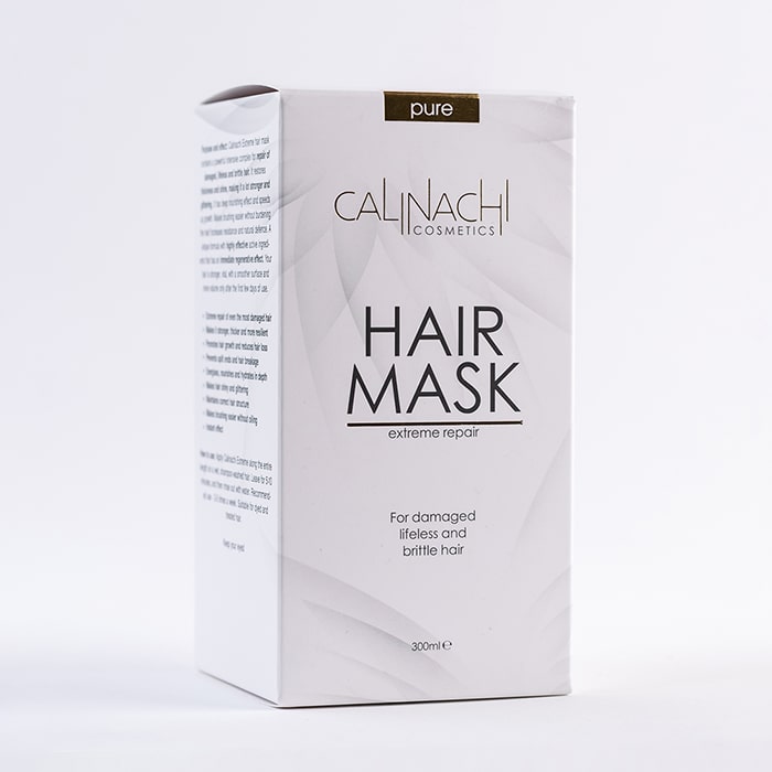 Възстановяваща маска за суха към нормална коса Calinachi Extreme Repair Hair Mask се бори успешно с косопада, уплътнява косъма и регенерира кожата на главата. Хидратира, подхранва и придава блясък на изтощената коса. Маската за коса и скалп Calinachi съдържа мощен интензивен комплекс за възстановяване на увредената и накъсваща се коса. Заздравява и укрепва косъма, ускорява растежа и придава блясък. Улеснява разресването, без да натоварва косата! Увеличава устойчивостта и естествената защита. Уникалната формула с високоефективни активни съставки осгиурява незабавно действие. Косата е по-силна, жизнена, с по-гладка повърхност още след първите няколко дни употреба. Подходяща е за суха и изтощена коса, за сух и нормален скалп.