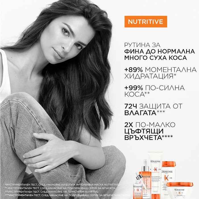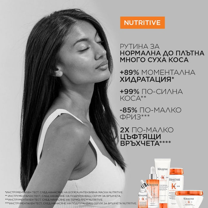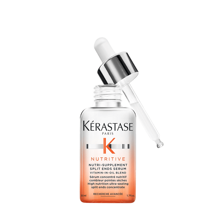 Kerastase Nutritive Nutri-Supplement Split Ends Serum е силно подхранващ серум за цъфтящи връхчета, обогатен с мощна формула, която регулира и защитава нивата на хидратация, за да предпази косата от накъсване. Моментално хидратира, осигурява подхранена, блестяща и здрава на вид коса. Грижа, обогатена с полимери за запечатване на сухите краища, която помага за предотвратяването на появата на цъфтящи връхчета. Изключително подхранващото масло действа против изсушаване на цъфтящите краища и има полупрозрачна текстура.