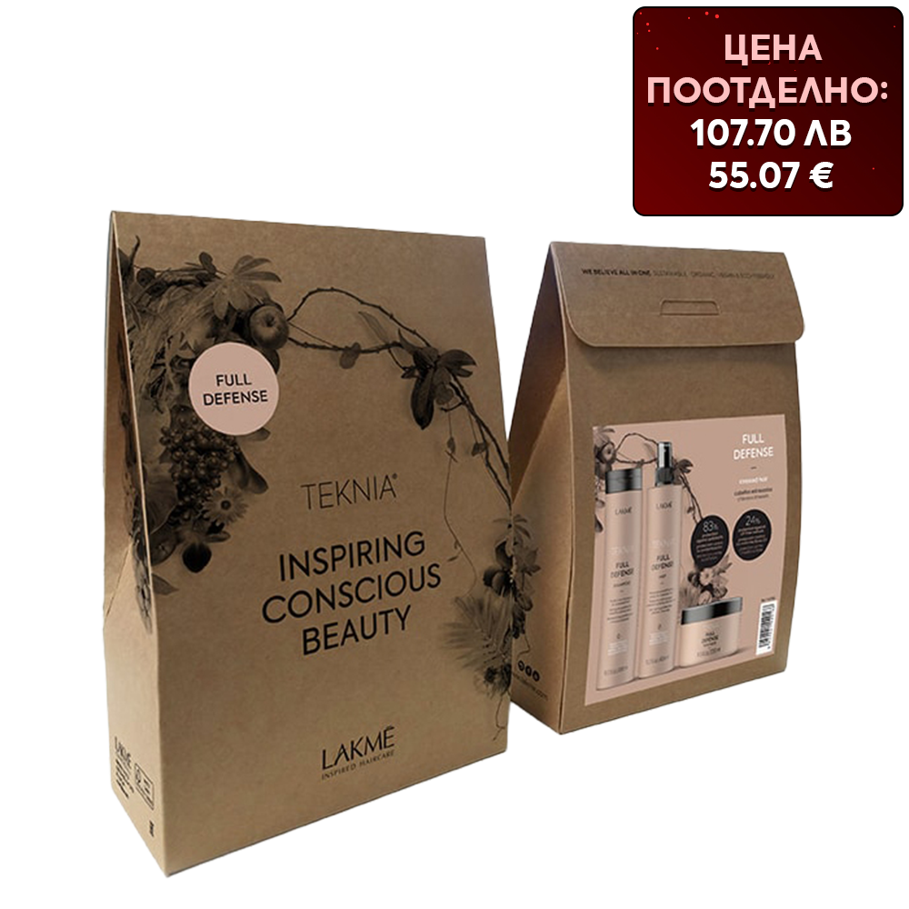 Серия LAKME TEKNIA Full Defense съдържа филтри с висок афинитет към фибрите на косъма, които осигуряват дълготрайна защита от UVA и UVB лъчи. Предлага пълна защита за косата от вредното въздействие на слънцето, замърсяването от околната среда и от “синята светлина” на електронните устройства. Осигурява пълноценна грижа, която предотвратява изтощаване и увреждане на косата. Запазва жизнеността и прави косъма устойчив на увреждане от външни агресори.